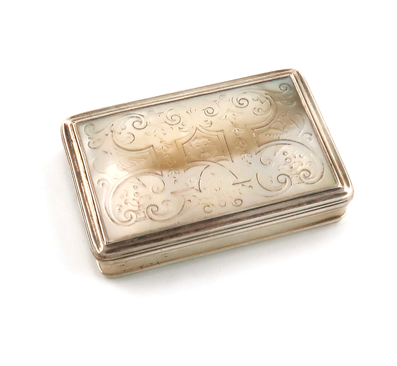 rectangular form, the hinged cover with a mother-of-pearl panel engraved with foliate scroll decoration and with a central lion mask, plain sides and base, length 6.5cm.