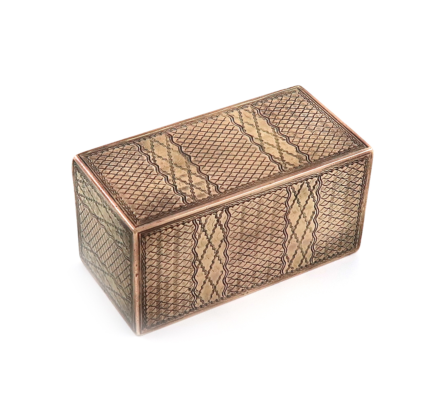 rectangular form, engine-turned decoration, with a small hinged cover which opens to release the main hinged cover, length 7.9cm.