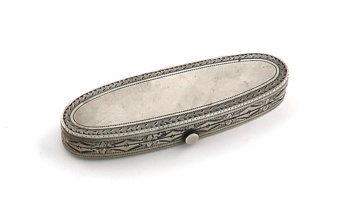 rounded rectangular form, engraved radiating decoration, the interior of the base velvet lined, the interior of the cover fitted with a mirror, length 6.5cm, approx. weight 0.8oz.
