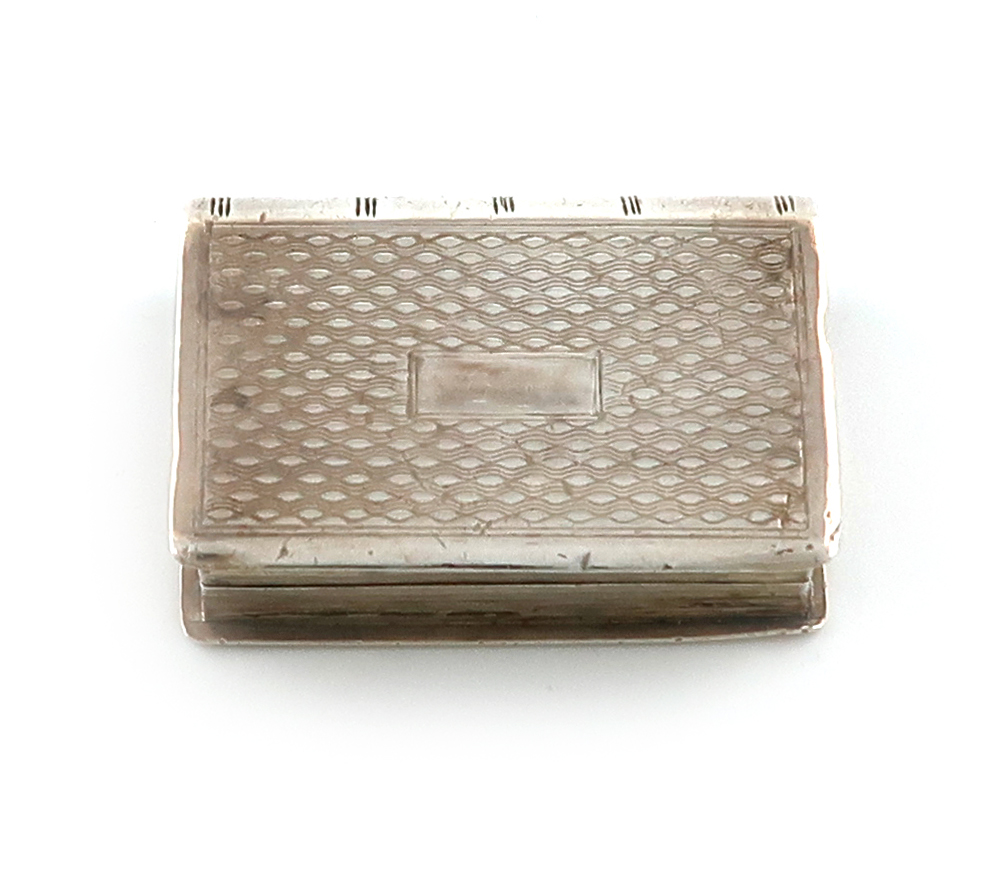 rectangular form, engine-turned decoration, reeded spine, the interior with a silver-gilt filigree grille, length 3.3cm, approx. weight 0.5oz.