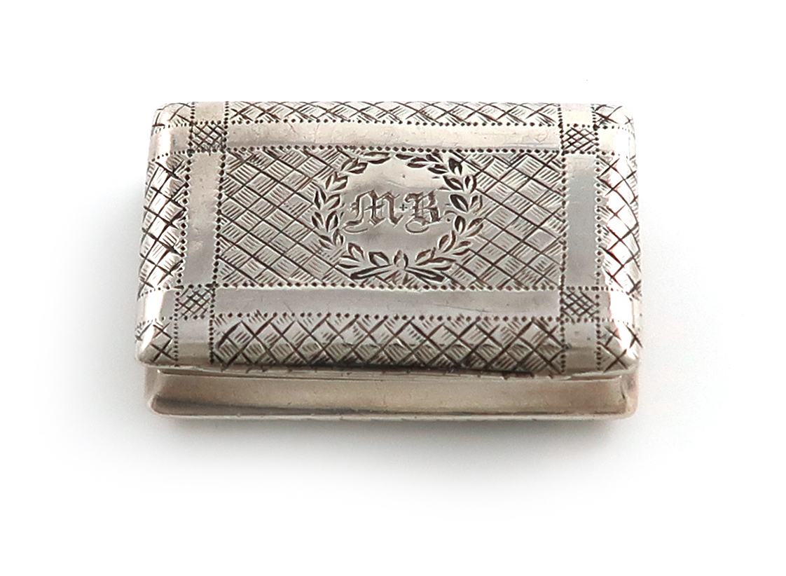 rectangular form, engraved decoration, the cover initialled 'M.B', the interior with a pierced and engraved foliate grille, length 3.7cm, approx. weight 0.6oz.