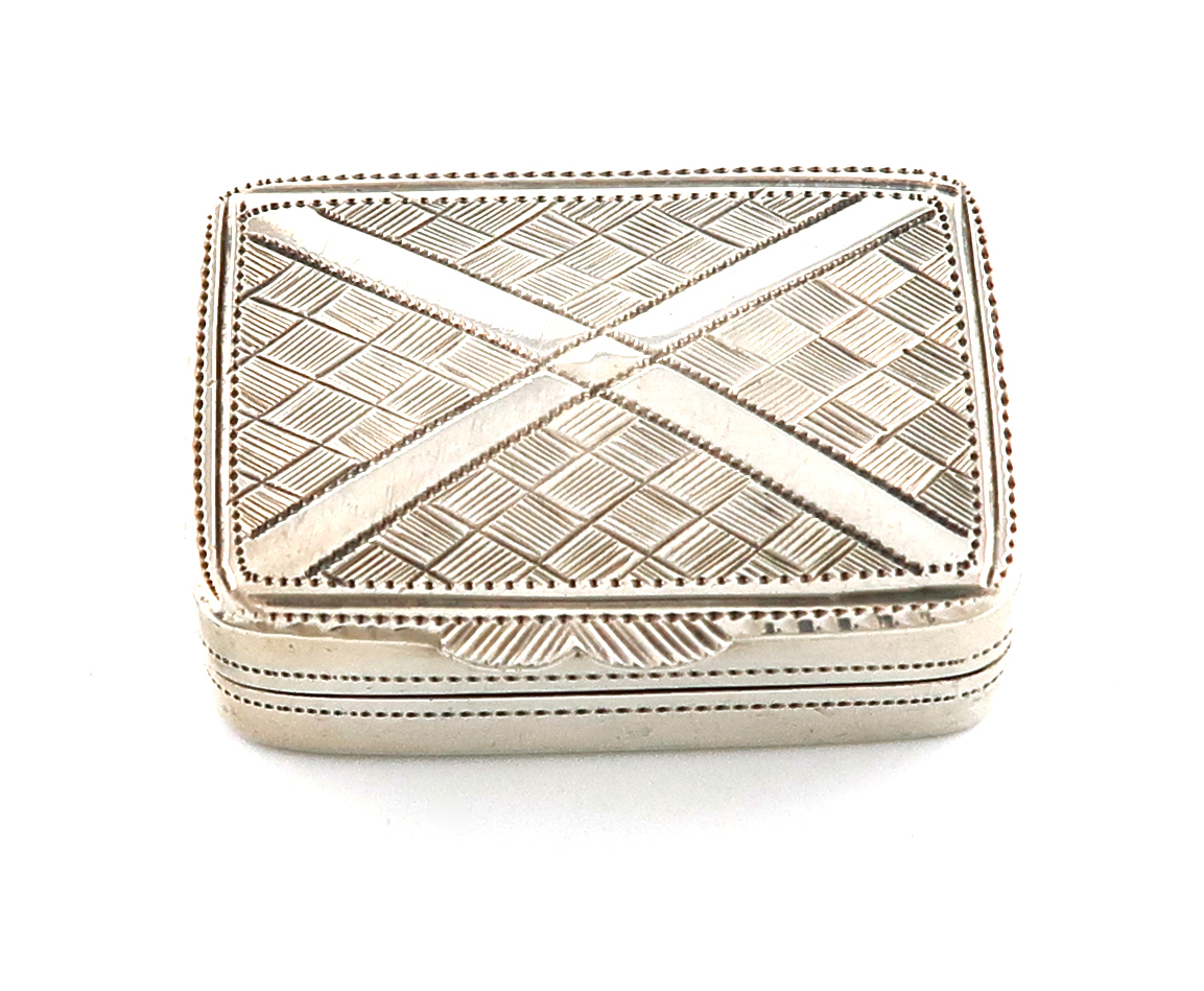 rectangular form, the cover engraved with chequerboard decoration, pierced and foliate silver-gilt grille, length 3.3cm, approx. weight 0.6oz.