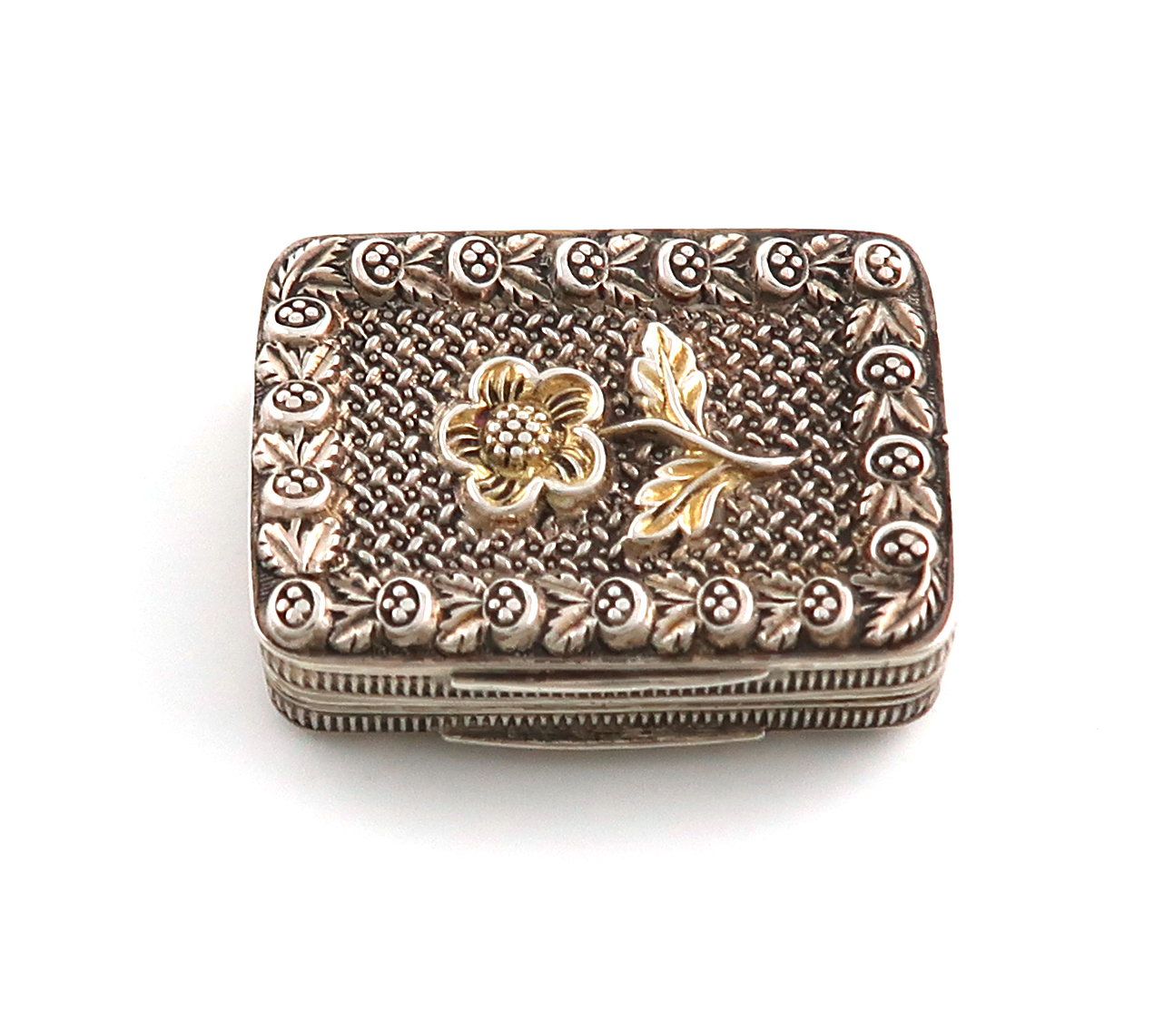 rectangular form, the hinged cover and base with a central flower on a matted background, foliate border, the interior with a pierced and engraved foliate grille, length 3cm, approx. weight 0.4oz.