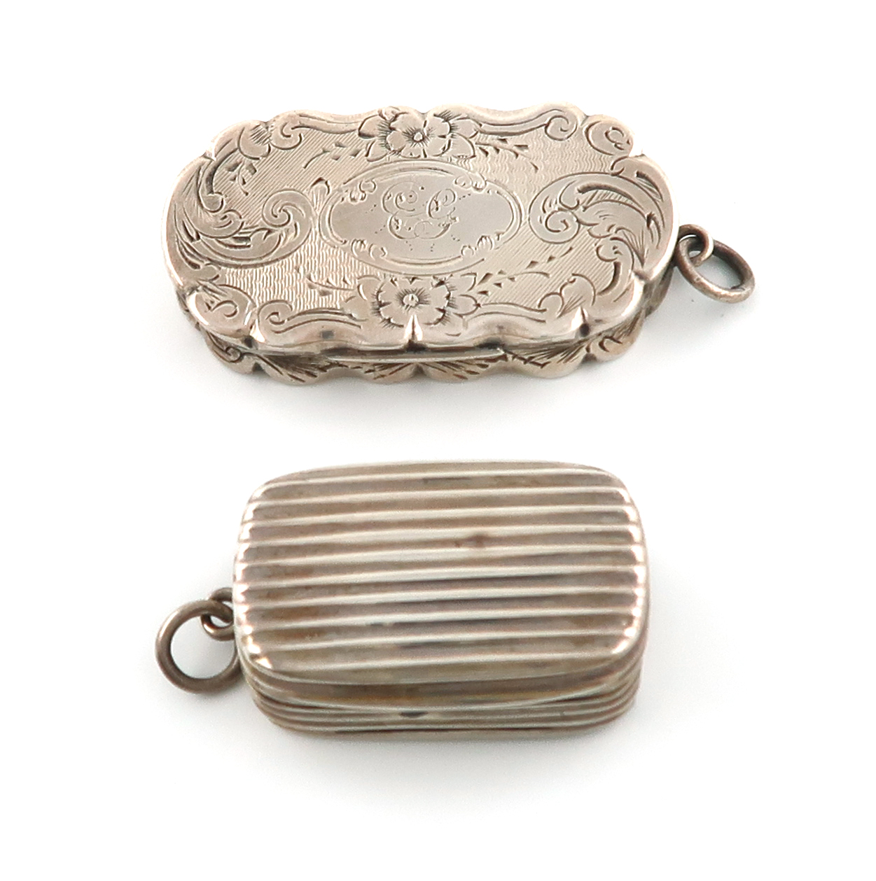 rounded rectangular form, engraved foliate decoration, pierced foliate scroll grille, plus a George III silver vinaigrette, by Joseph Taylor, Birmingham 1800, reeded rounded rectangular form, the interior with a silver-gilt filigree grille, approx. total weight 1.1oz. (2)