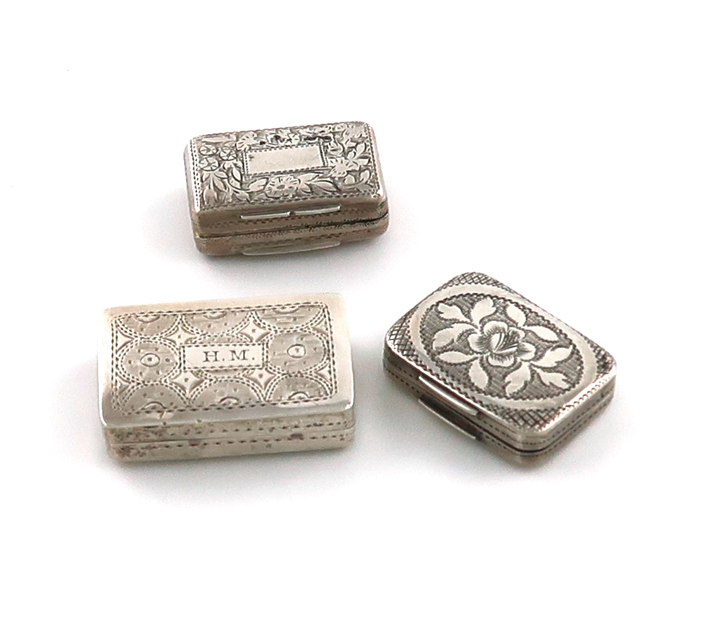 comprising: a George IV one, by Edward Smith, Birmingham 1828, rectangular form, engraved decoration, plus a George III one by Samuel Pemberton, Birmingham 1809, and another by Thomas Shaw, Birmingham 1824, approx. total weight 0.8oz. (3)