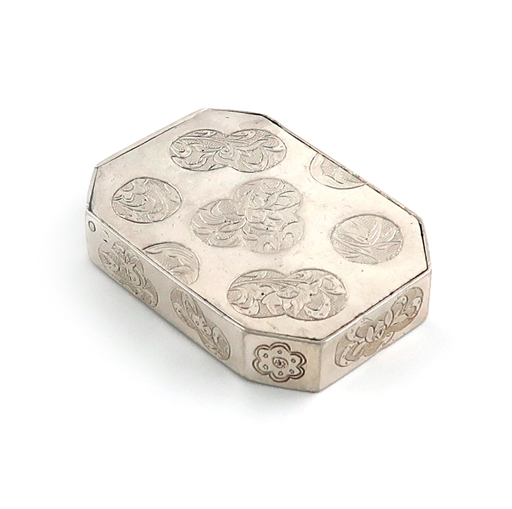 rectangular form, canted corners, engraved with circular discs of foliate decoration on a matted background, the hinged back opens to reveal the hinged cover, length 5cm, approx. weight 1oz.