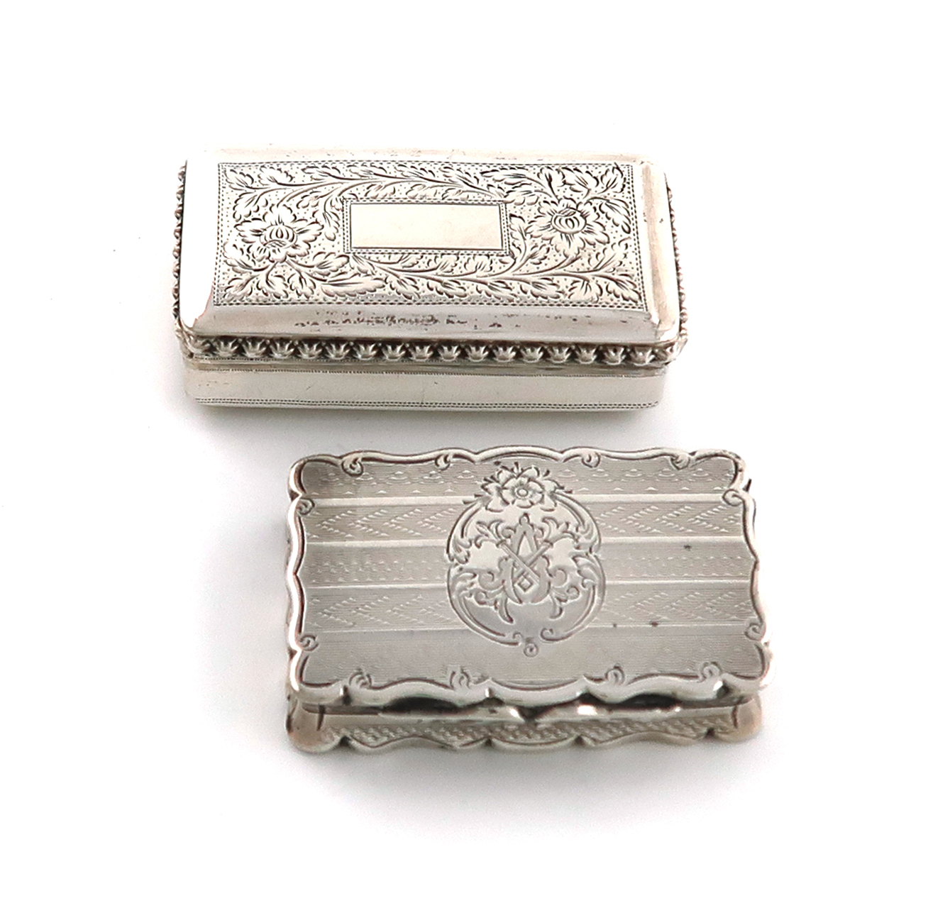 rectangular form, engraved decoration, beaded border, length 5.7cm, plus a Victorian silver snuff box, by George Unite, Birmingham 1876, engine-turned decoration, central cypher, approx. weight 2oz. (2)