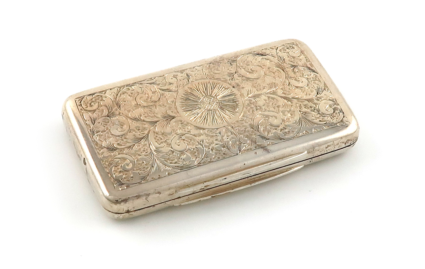 slender rectangular form, the cover with chased foliate decoration, length 8.4cm, approx. weight 2.5oz.