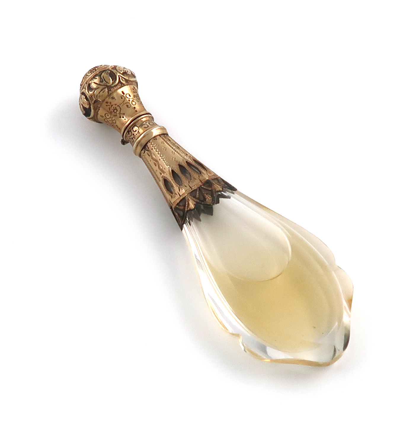 A late-19th century French silver-gilt mounted clear glass scent bottle,