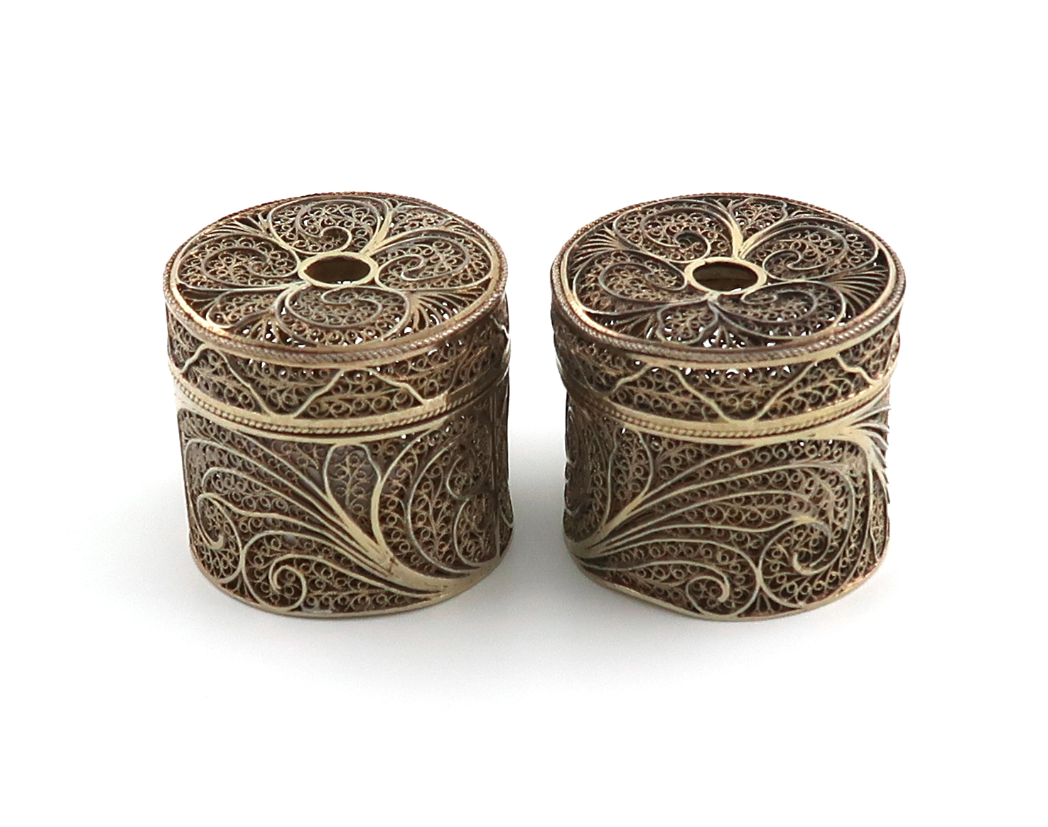 cylindrical form, pull-off covers with a central hole, height 3.5cm, approx. weight 2oz. (2)