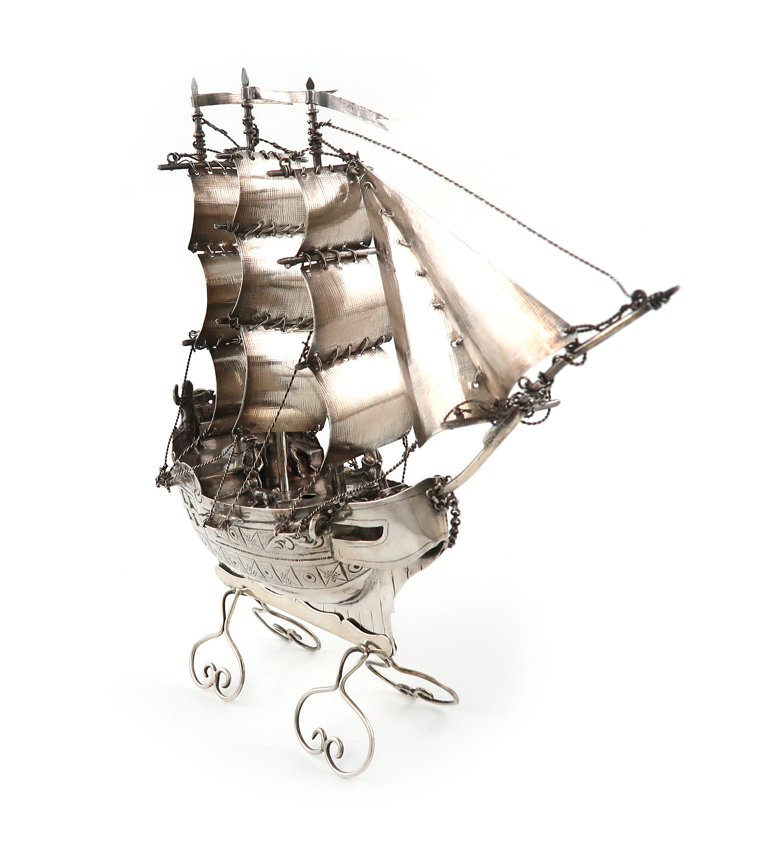 with three masts in full sail, with figures on the deck, on a wire-work scroll stand, height 23cm, approx. weight 11.7oz.
