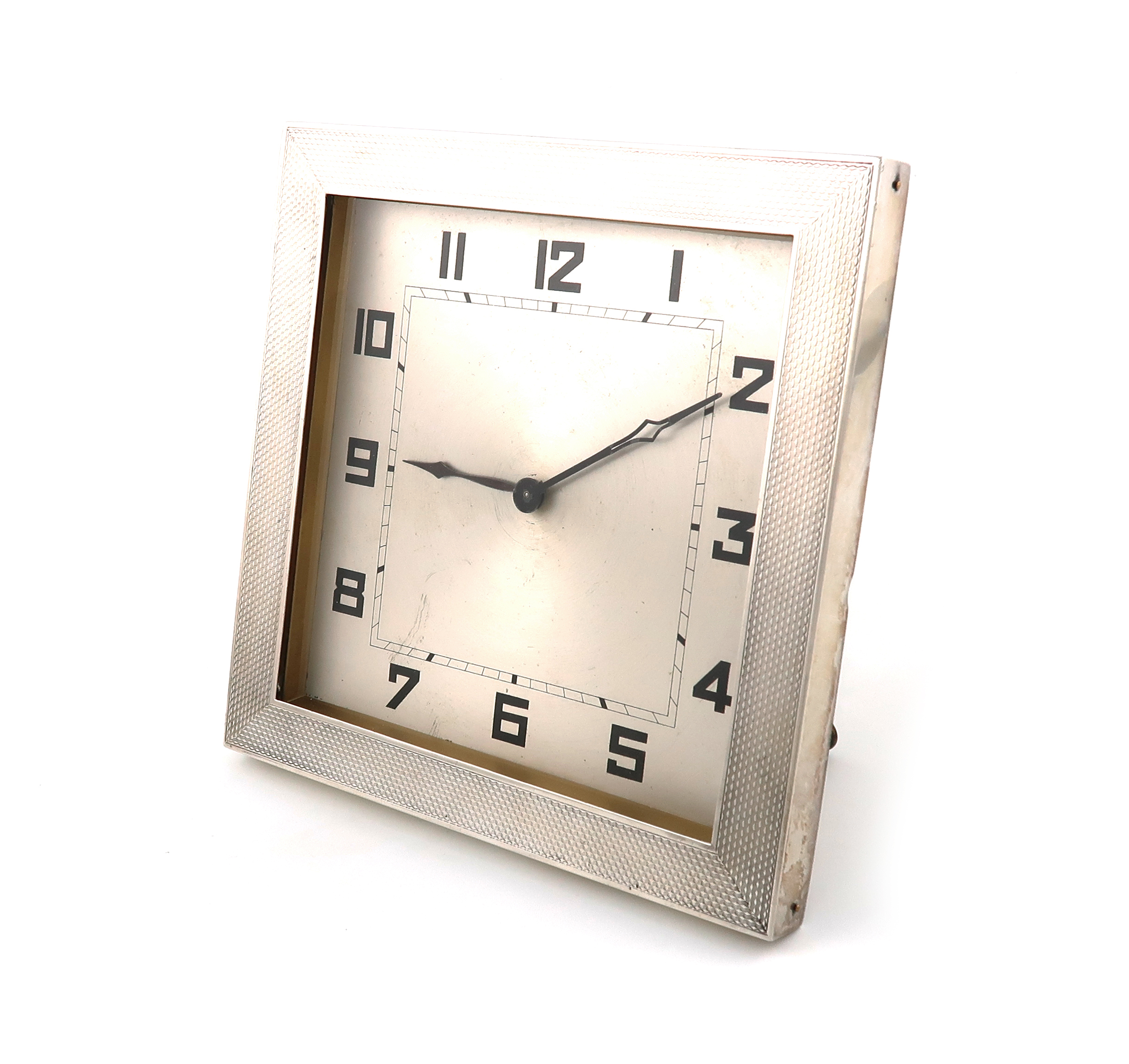 square form, engine-turned decoration, wire-work strut back, height 17.4cm.