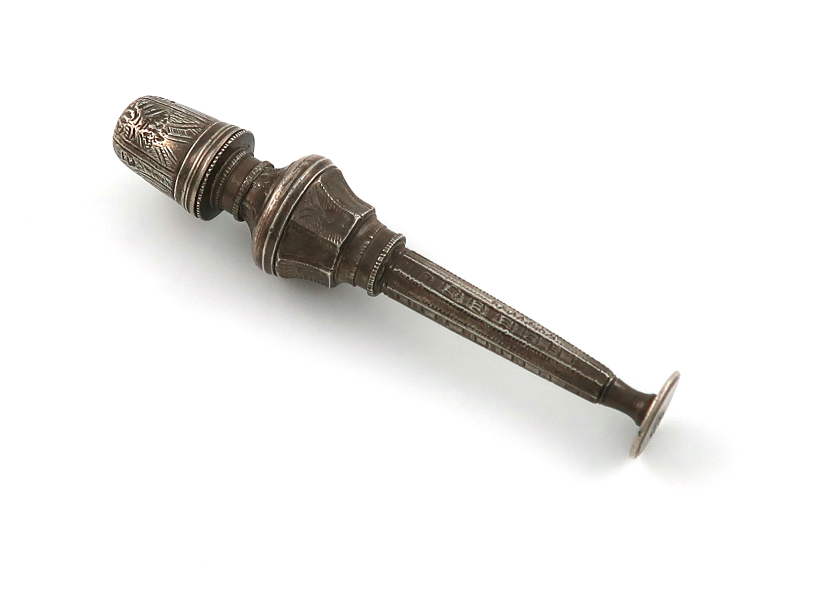 tapering form, the screw-off thimble reveals a cotton reel, with a central compartment, the base with a needle case, height 10.5cm, approx. weight 1.6oz.