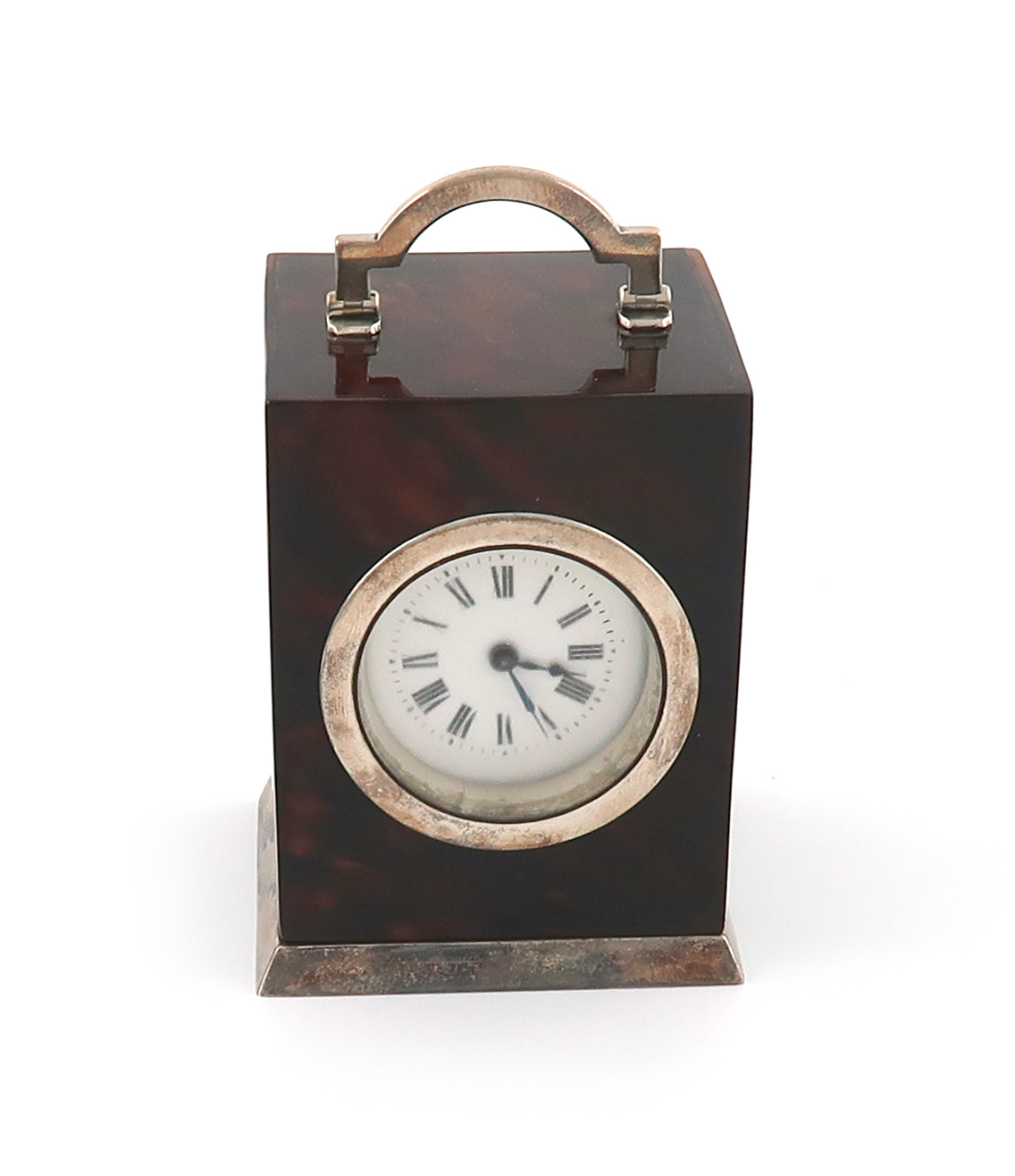 rectangular form, hinged carrying handle, enamel dial, plain mounts, height 11.3cm.