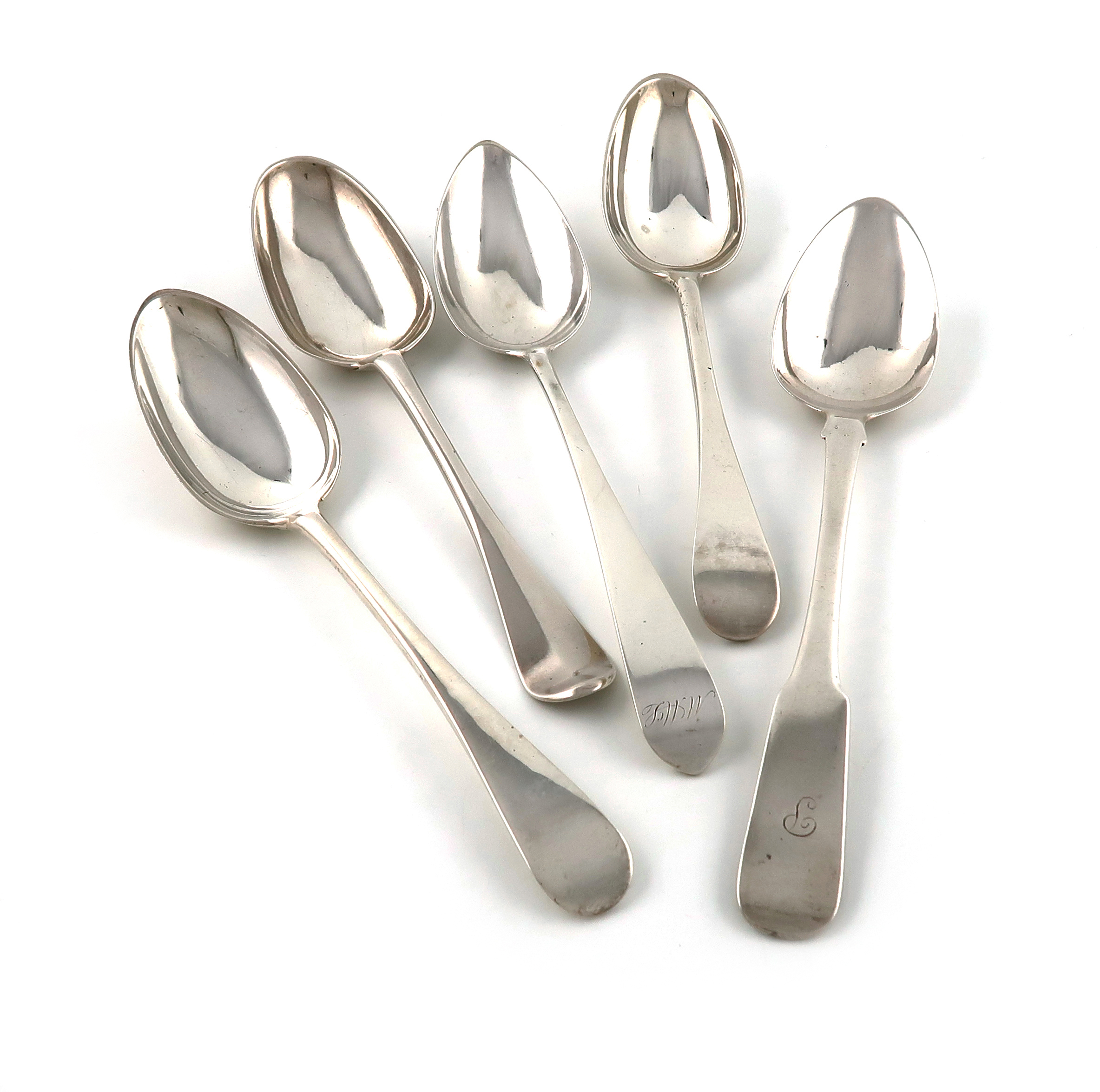 comprising: a Hanoverian pattern one, by Alexander Aitchison I, Edinbugh 1765, two Edinburgh-made Old English pattern spoons, by John McKay, 1804 and William Davie, 1784, and two Greenock spoons, one Fiddle pattern, no makers mark, circa 1820 and one Celtic point, by John Heron, circa 1800, approx. weight 10oz. (5)