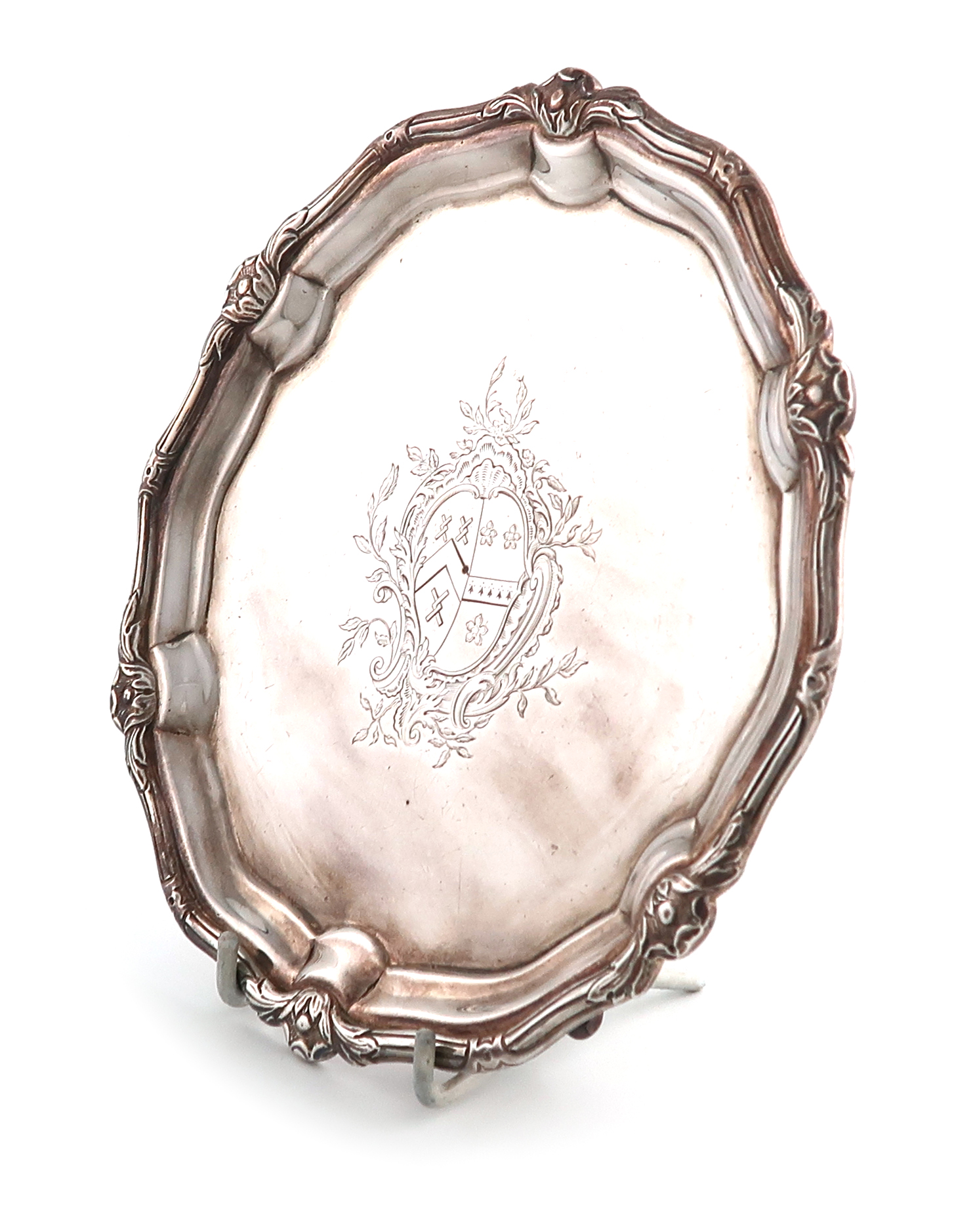 circular form, foliate and scroll border, the centre with an armorial, within foliate mantling, on three scroll bracket feet, diameter 18.4cm, approx. weight 11.2oz.