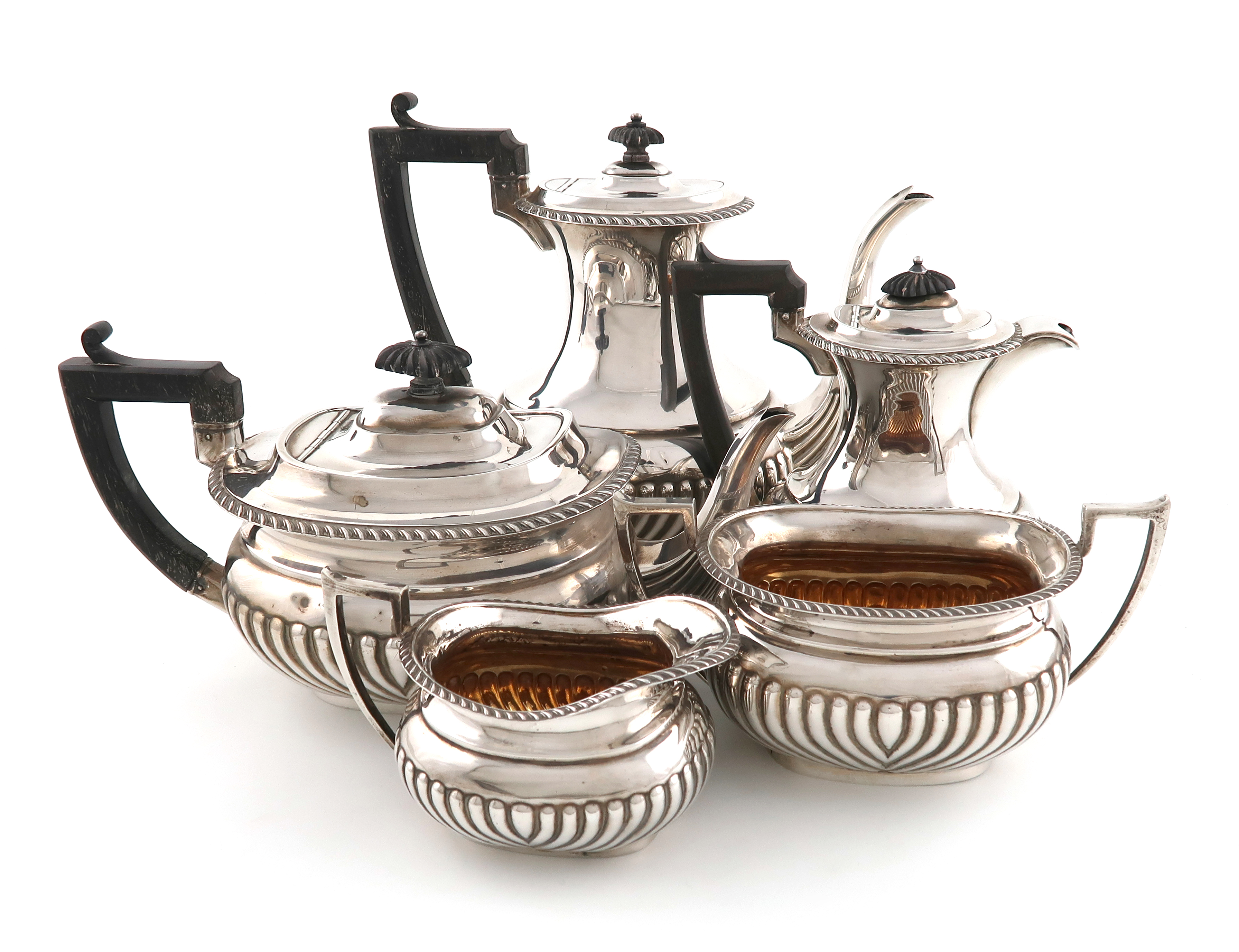 oblong-bellied form, part-fluted decoration, scroll handles, approx. weight 62oz. (5)