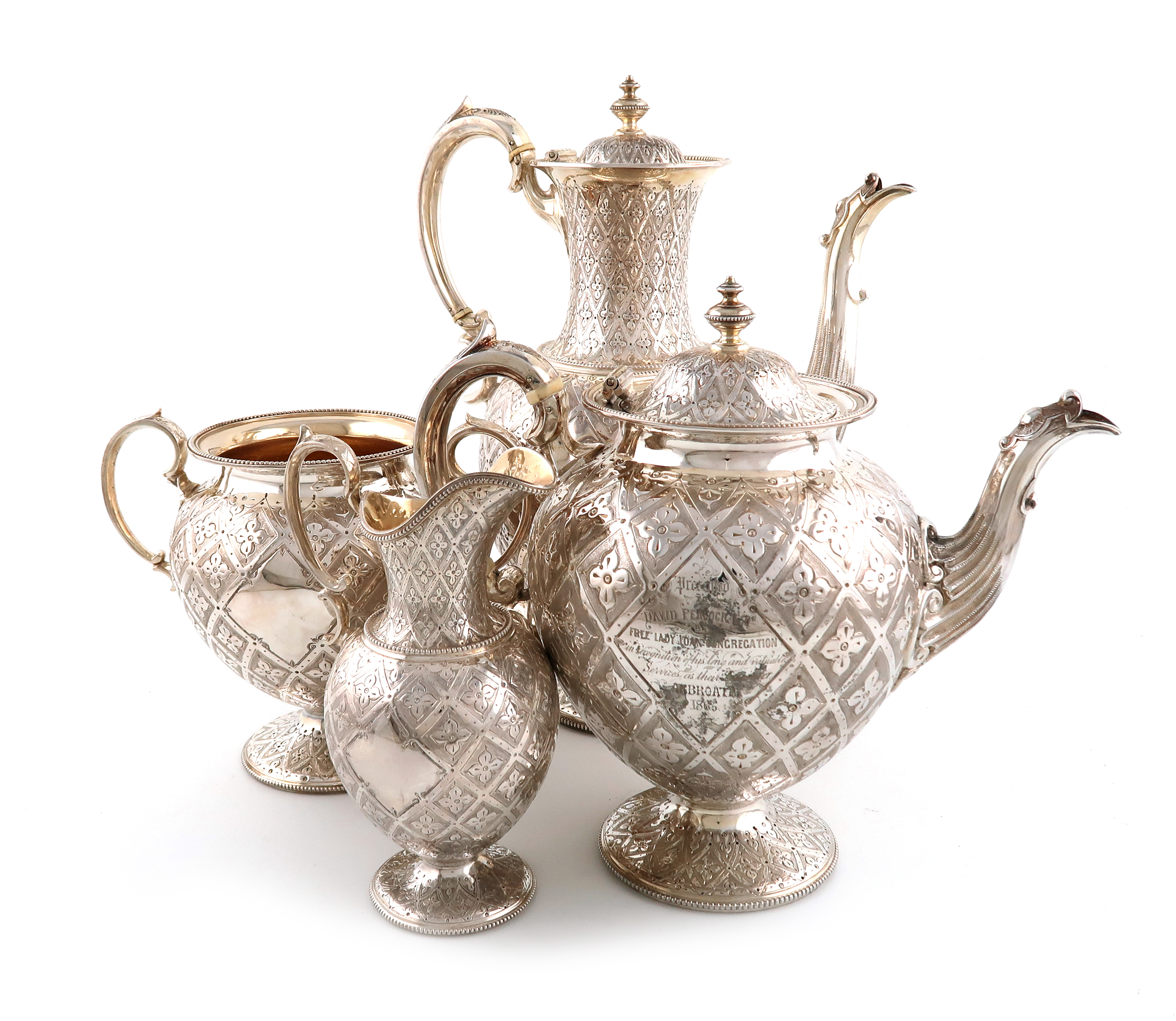 baluster form, with foliate motifs in diamond-shaped, surrounded matted background, the teapot inscribed, the scroll handles with ivory insulators, height of coffee pot 27.7cm, approx. weight 70oz. (4)