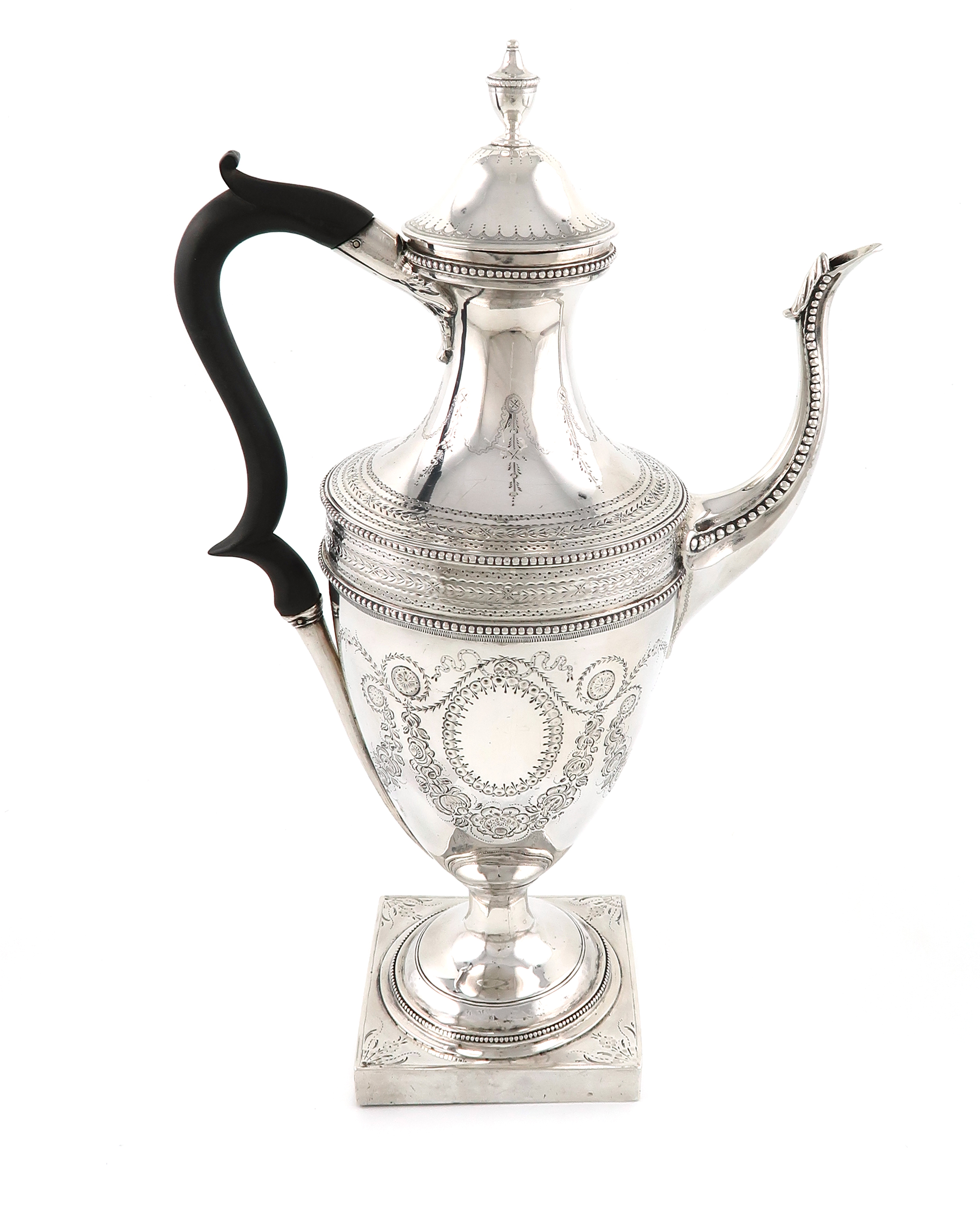 classical vase form, engraved decoration, scroll handle, pull-off domed cover with an urn finial, beaded borders, on a raised circular foot on a square base, height 34.5cm, approx. weight 30.6oz.