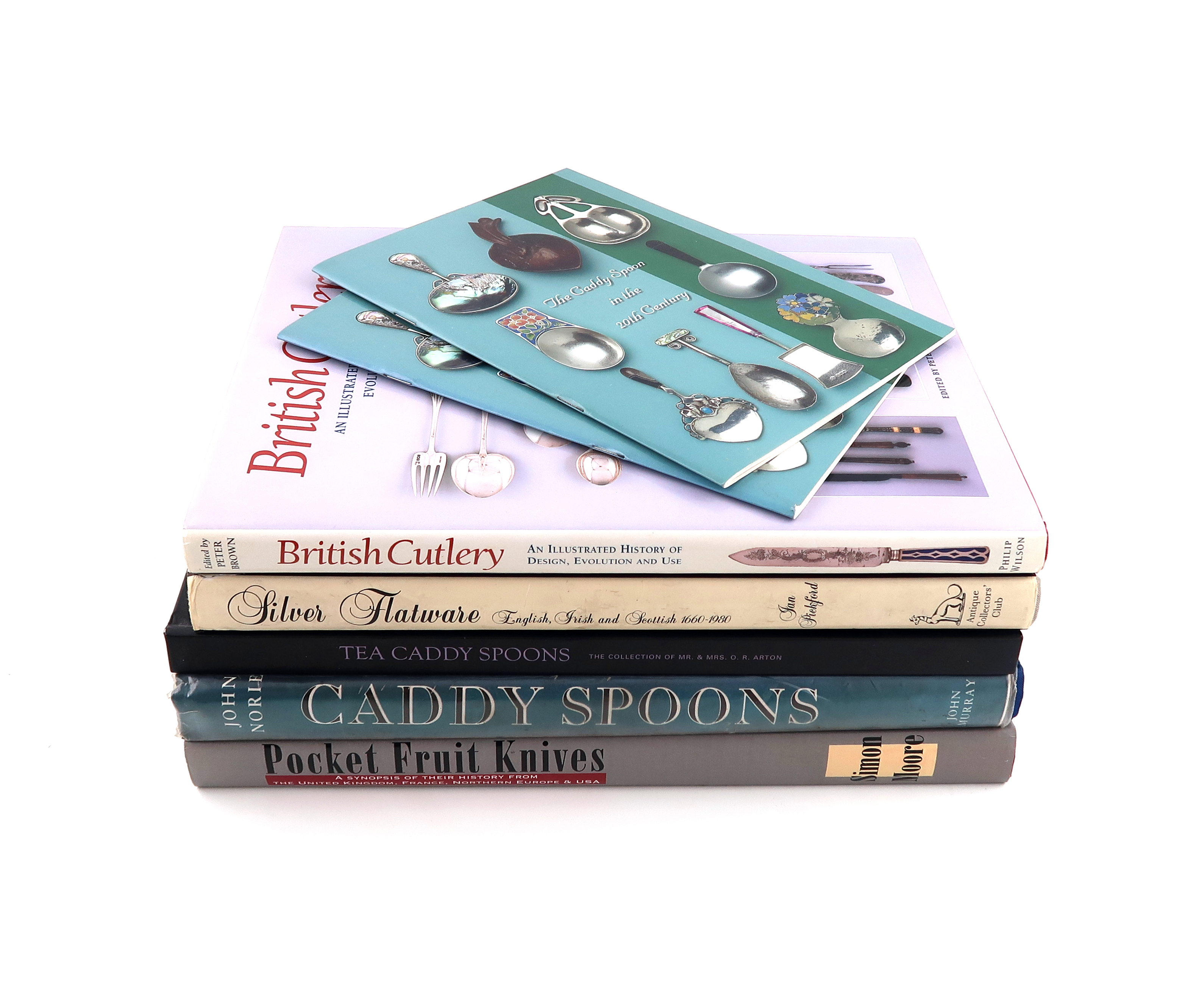 A small collection of silver reference books on flatware, comprising Norie, J., Caddy Spoons, The Arton Collection of Tea Caddy Spoons, The Caddy Spoon in the 20th Century, Pocket Fruit Knives, British Cutlery and Silver Flatware. (7)