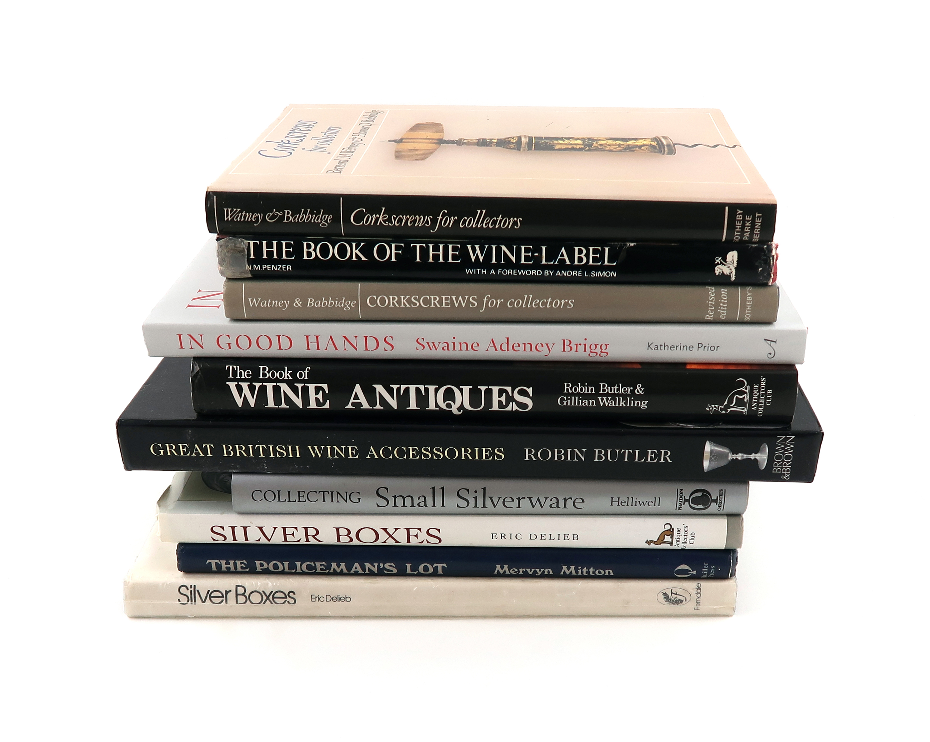 A collection of reference books on collectable silver, comprising: Delib, E., Silver Boxes, (x2), Collecting Small Silver, The Policeman's Lot, The Book of the Wine Label, Wine Antiques, Great British Wine Accessories 1550-1900, Corkscrews for Collectors,(x2), and In Good Hands 250 Years of Craftsmanship at Swaine, Adeneny and Brigg. (10)