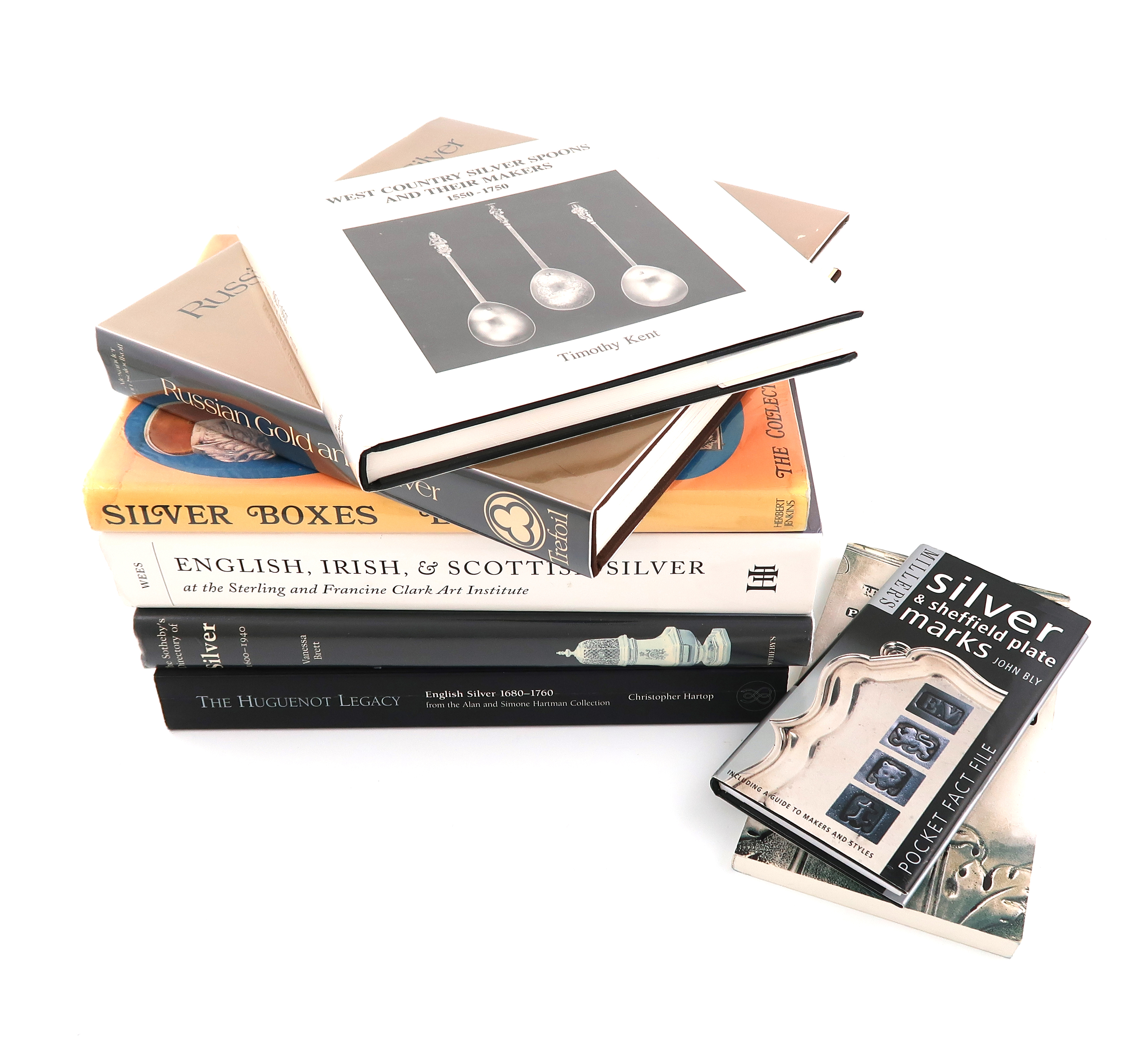 comprising: Kent, T., West Country Silver Spoons and their makers 1550-1750, hardbound 1992, Delieb, E., Silver Boxes, von Solodkoff, A., Russian Gold and Silver, and other volumes. (8)