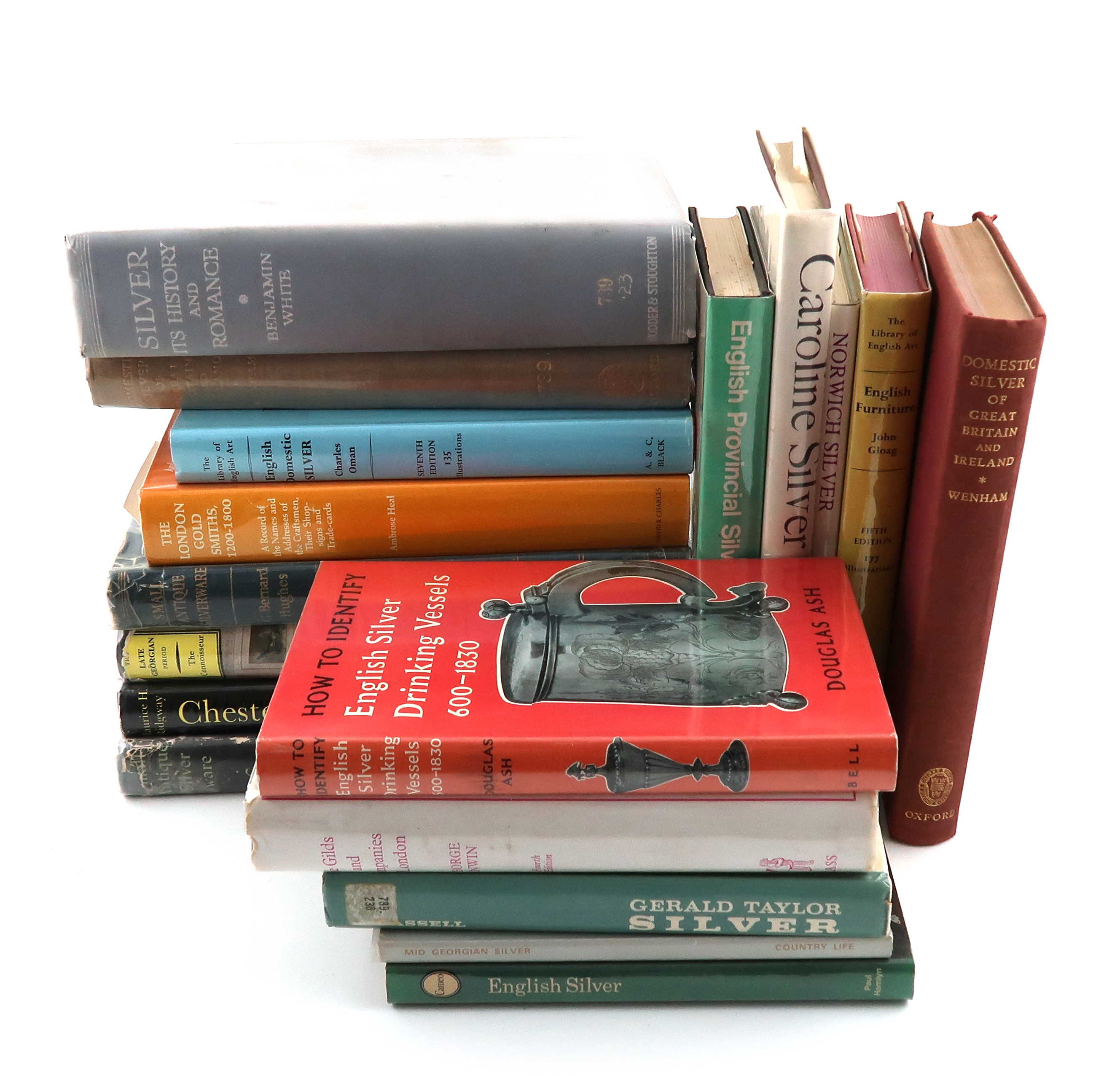 including various volumes by Kent, T. Sussex Silver and its Makers, Barnstaple Silver, London Silver spoon makers, and West Country Silver spoons and their makers 1550-1750, plus other volumes including Silver Flatware. (qty) (Two Boxes)