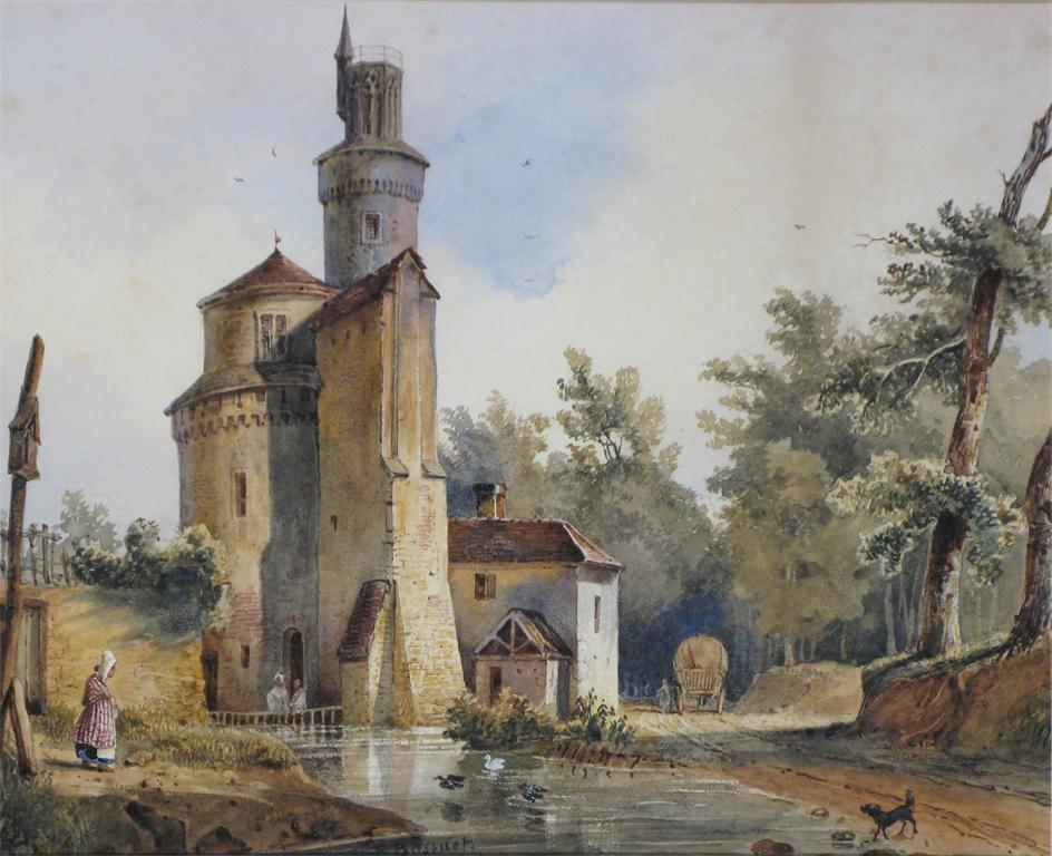 Francois Antoine Bossuet (1800-1899) Figures by a stream and tower in a village Signed ...