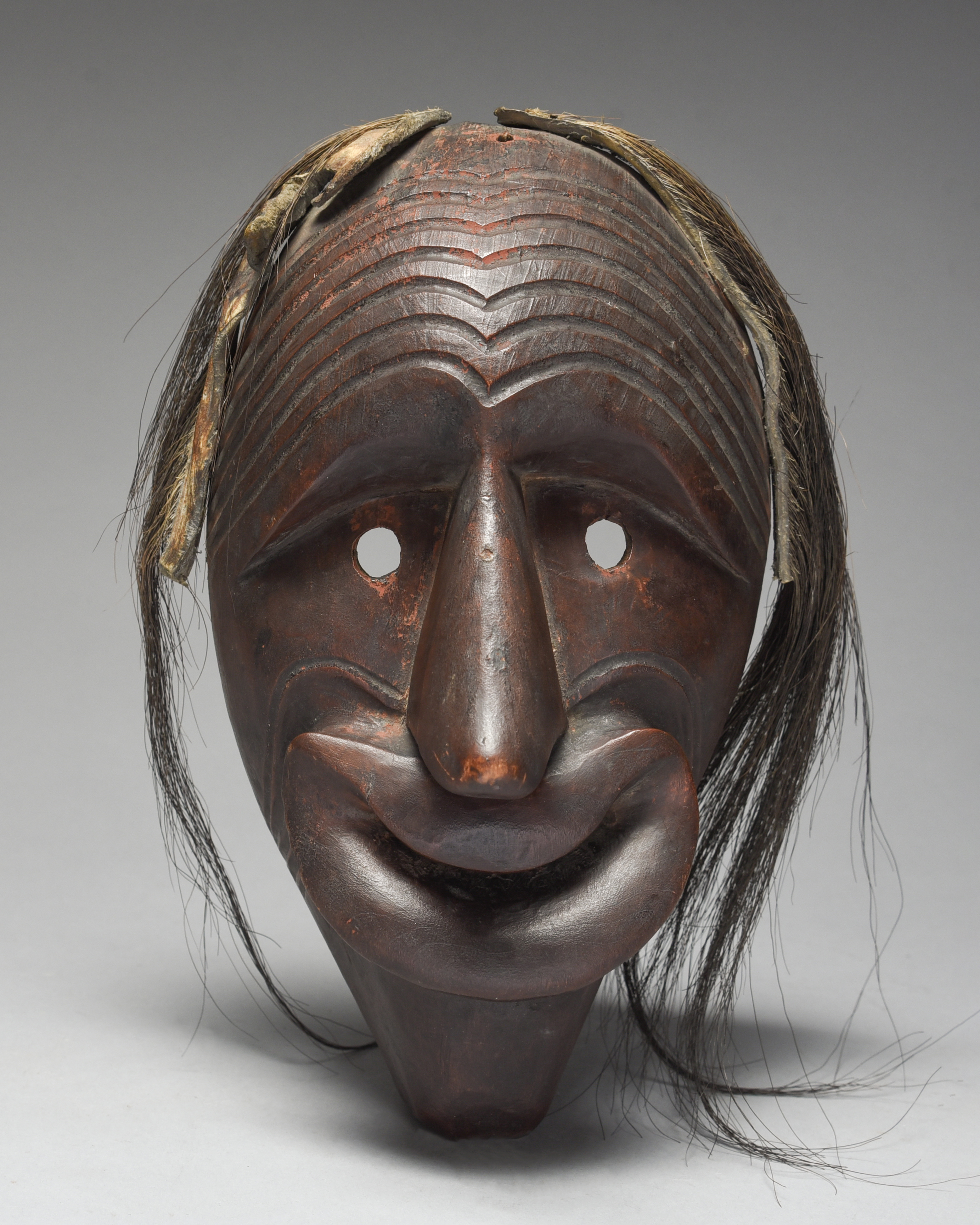 carved with a furrowed forehead, pierced circular eyes, a large nose and large lips with further lines to the cheeks, with a patinated red pigment and applied horse hair,