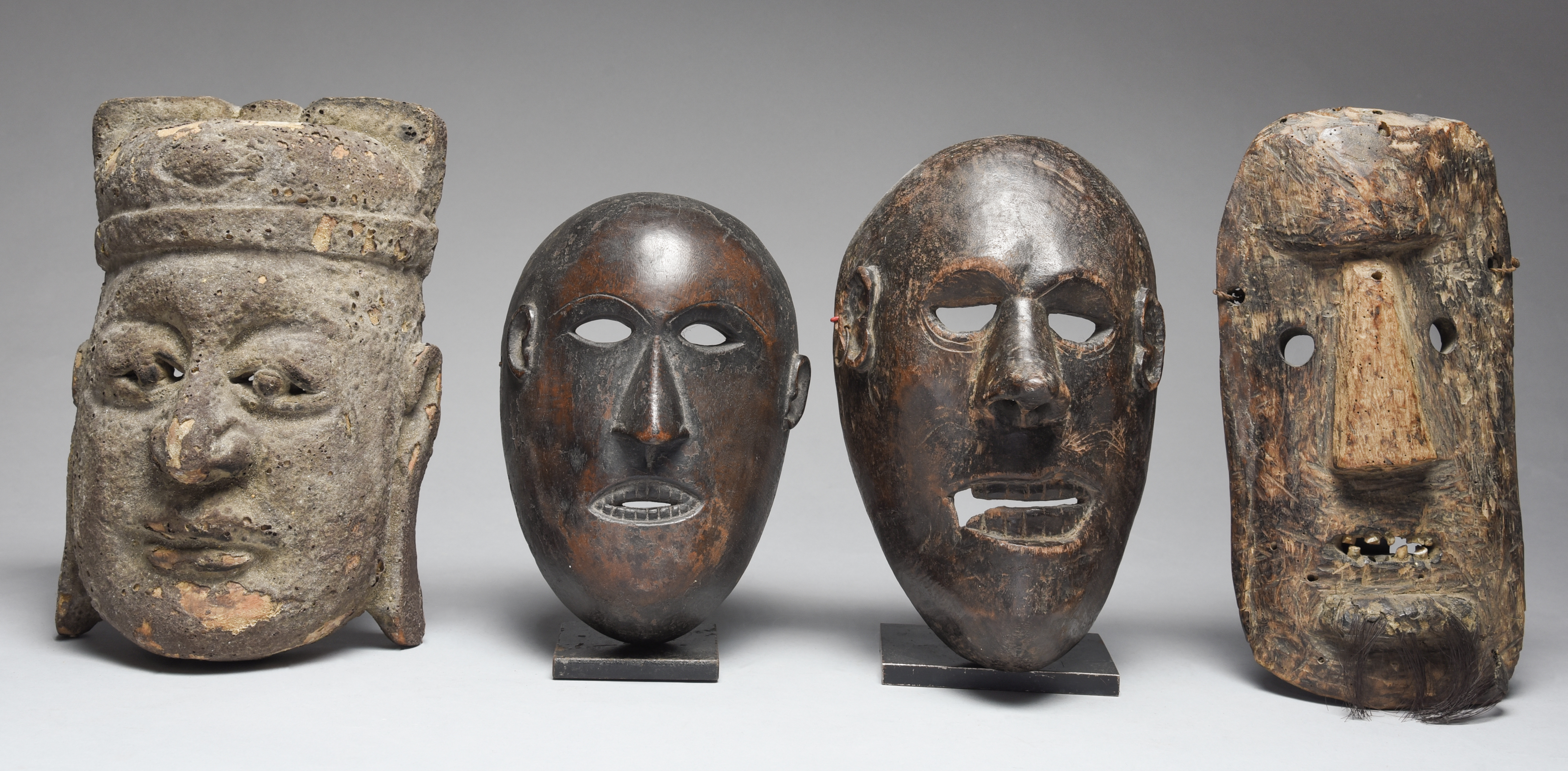 another with well defined features and the remains of a black patina and a red wax seal, 22.5cm high, and the third with inset bone teeth and an applied hair beard, 28cm high, together with a carved mask with a resin patina, 27cm high. (4)
