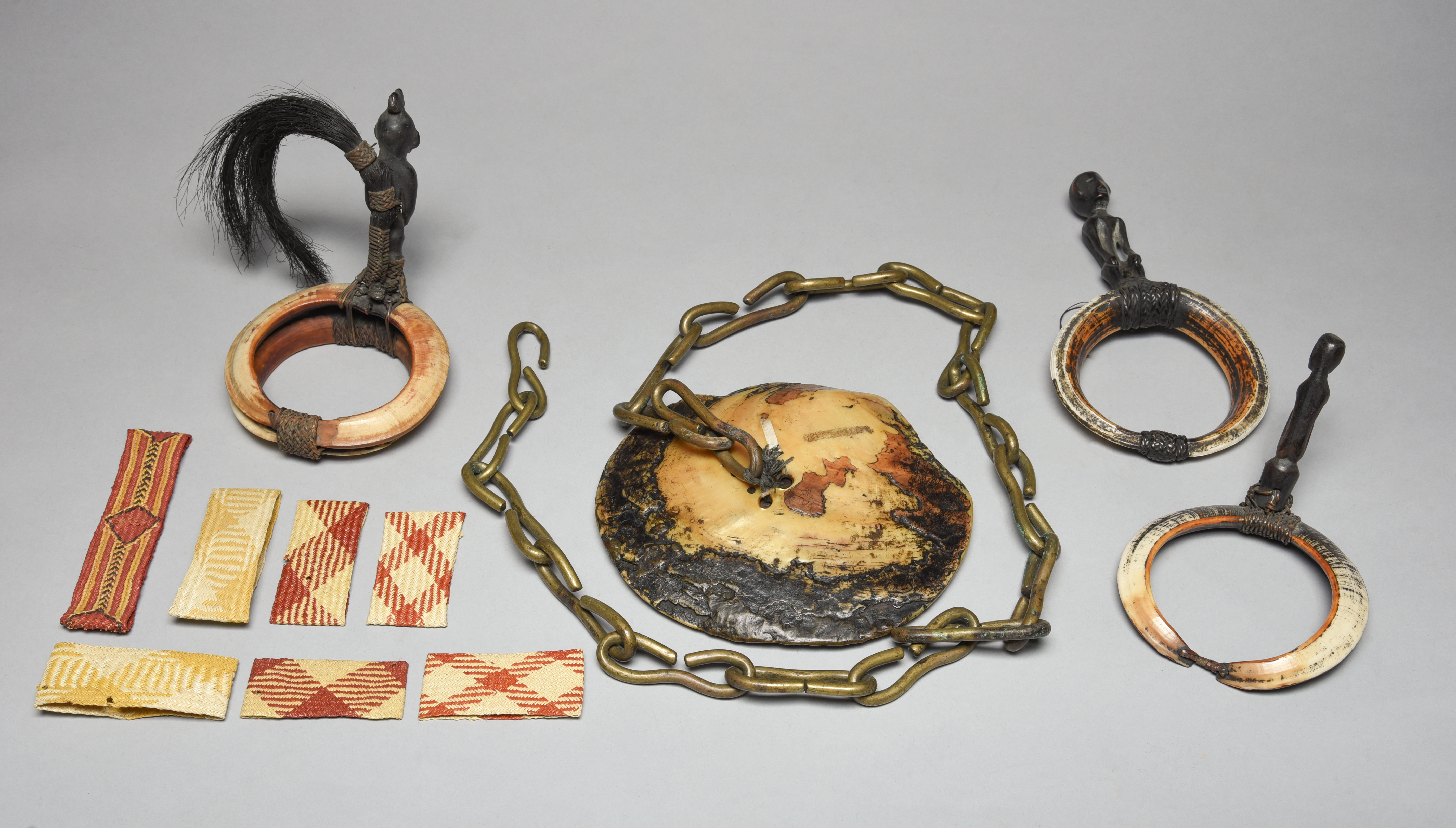 three Ifugao / Bontoc armbands, boar tusks with carved figures, and seven Solomon Islands armbands. (11)