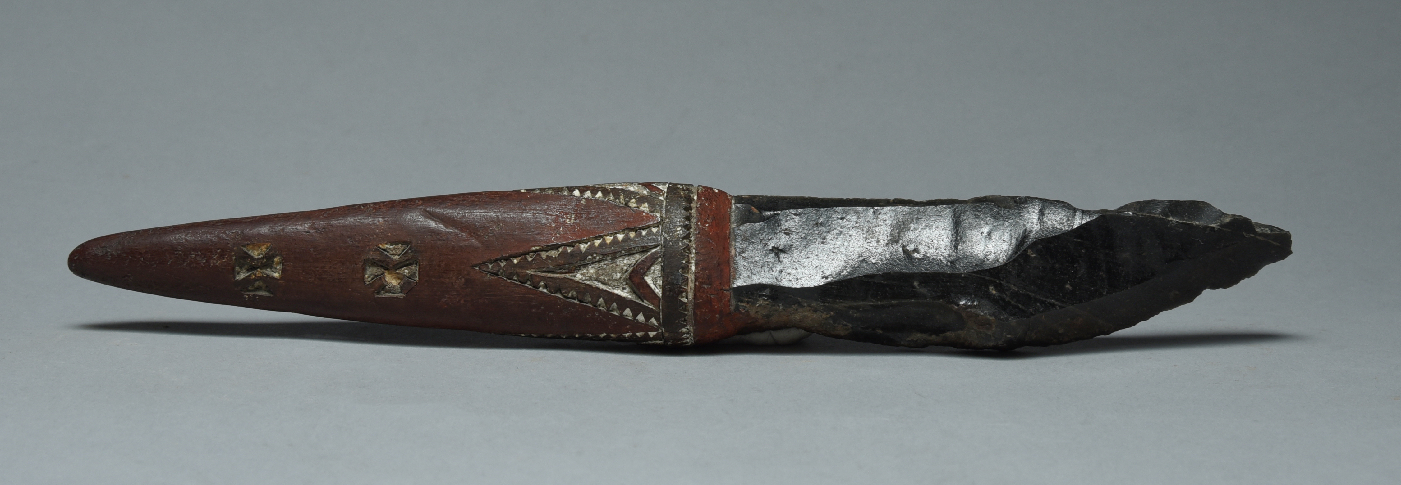 with an obsidian blade and a gum covered handle with carved geometric decoration and with ochre and lime,