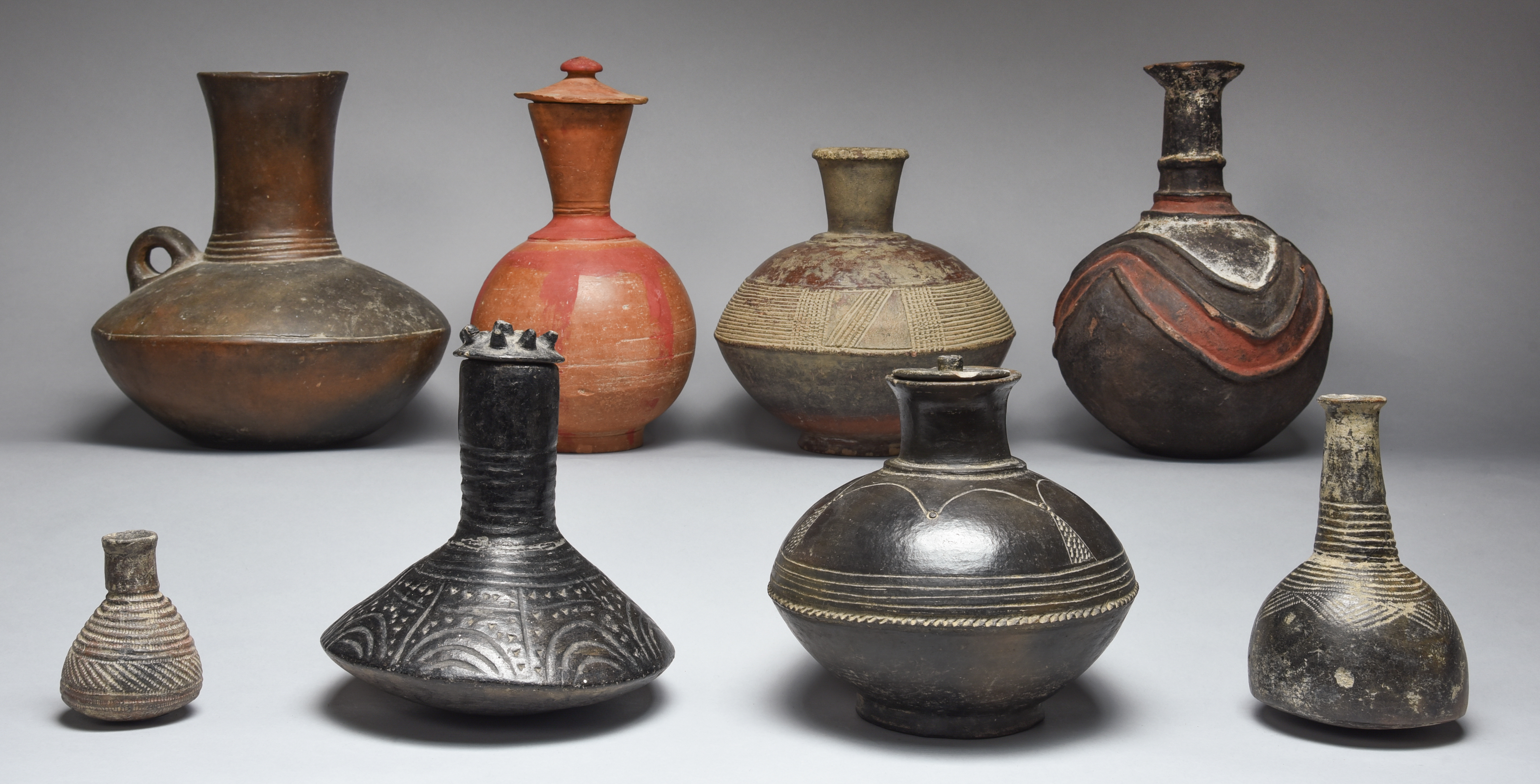 including Ashanti, with a noduled cover, 21cm high, Tutsi, with relief wavy line decoration, 27cm, and three Baule, two with covers and a mallet shape pottery vessel and another similar smaller vessel. (10)