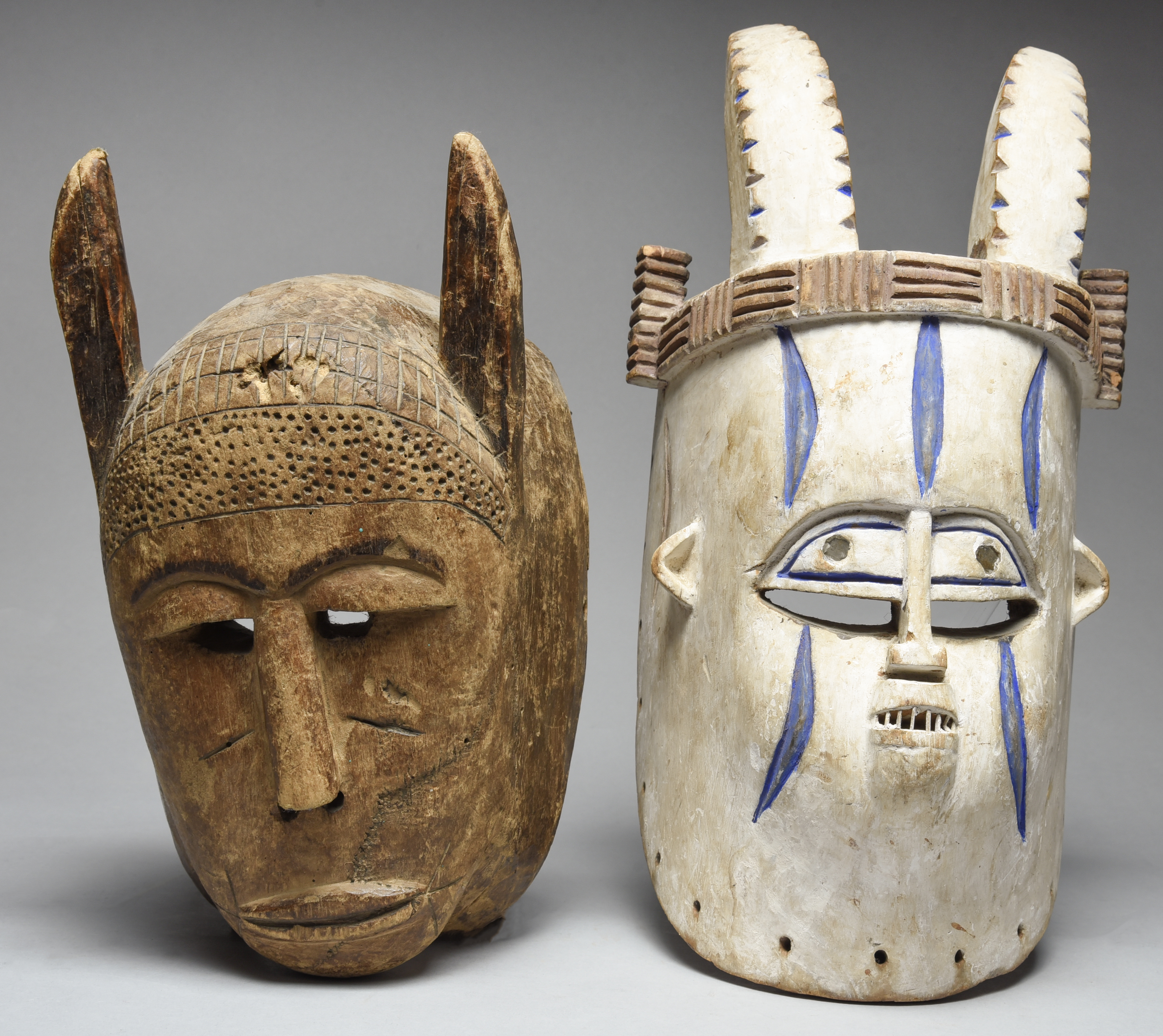 and a Nigerian mask, with a pair of horns, carved, punch dot and scorched decoration, 30cm high. (2)