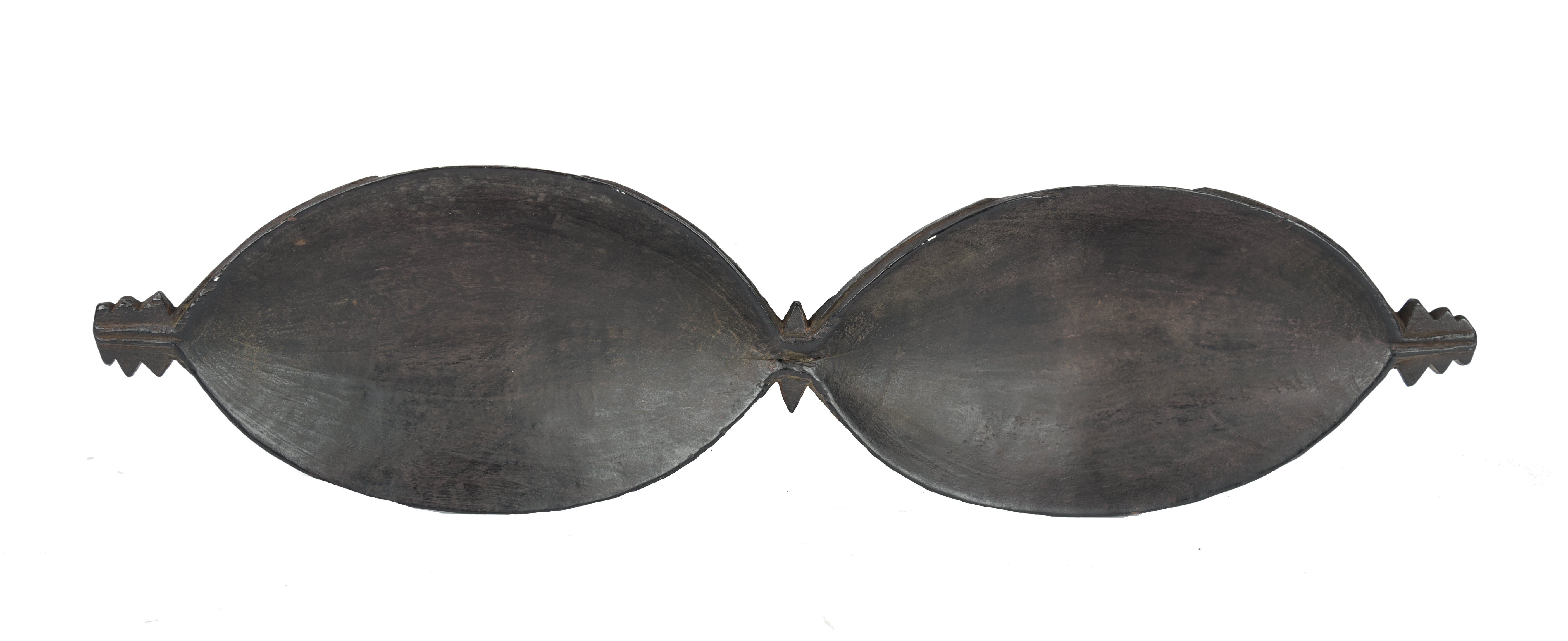 with carved notches to the channelled ends and centre, the underside with ridges, with traces of red pigment,