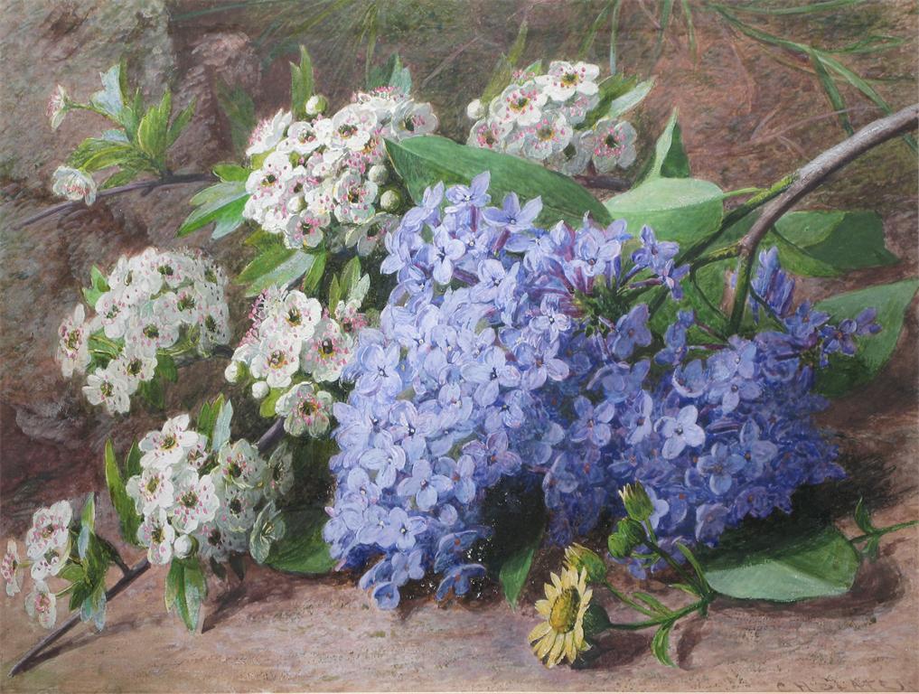 Charles Henry Slater (c.1820 - c.1890) Still life of blossom on a bank Signed Gouache 26.5 x...