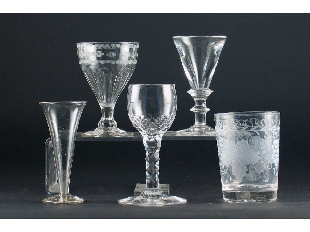 A wine glass, with a faceted stem and four other glasses. 18th and 19th century, 14cm. Max. (5)