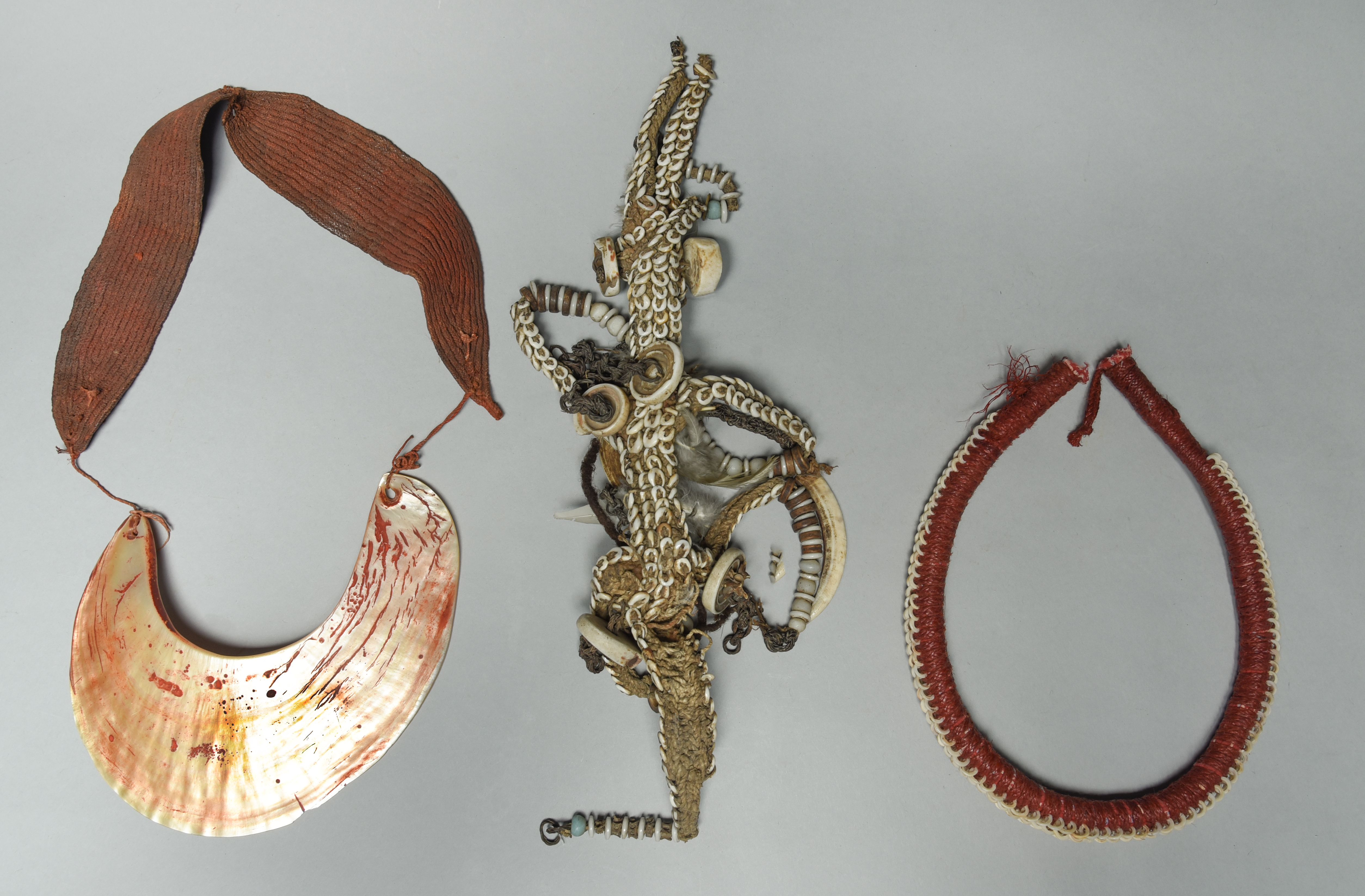 a Papua New Guinea ornament, shells, fibre, feathers, tusk and glass beads, 42cm long, and a Solomon Islands necklace, fibre and shells, 22cm deep. (3)
