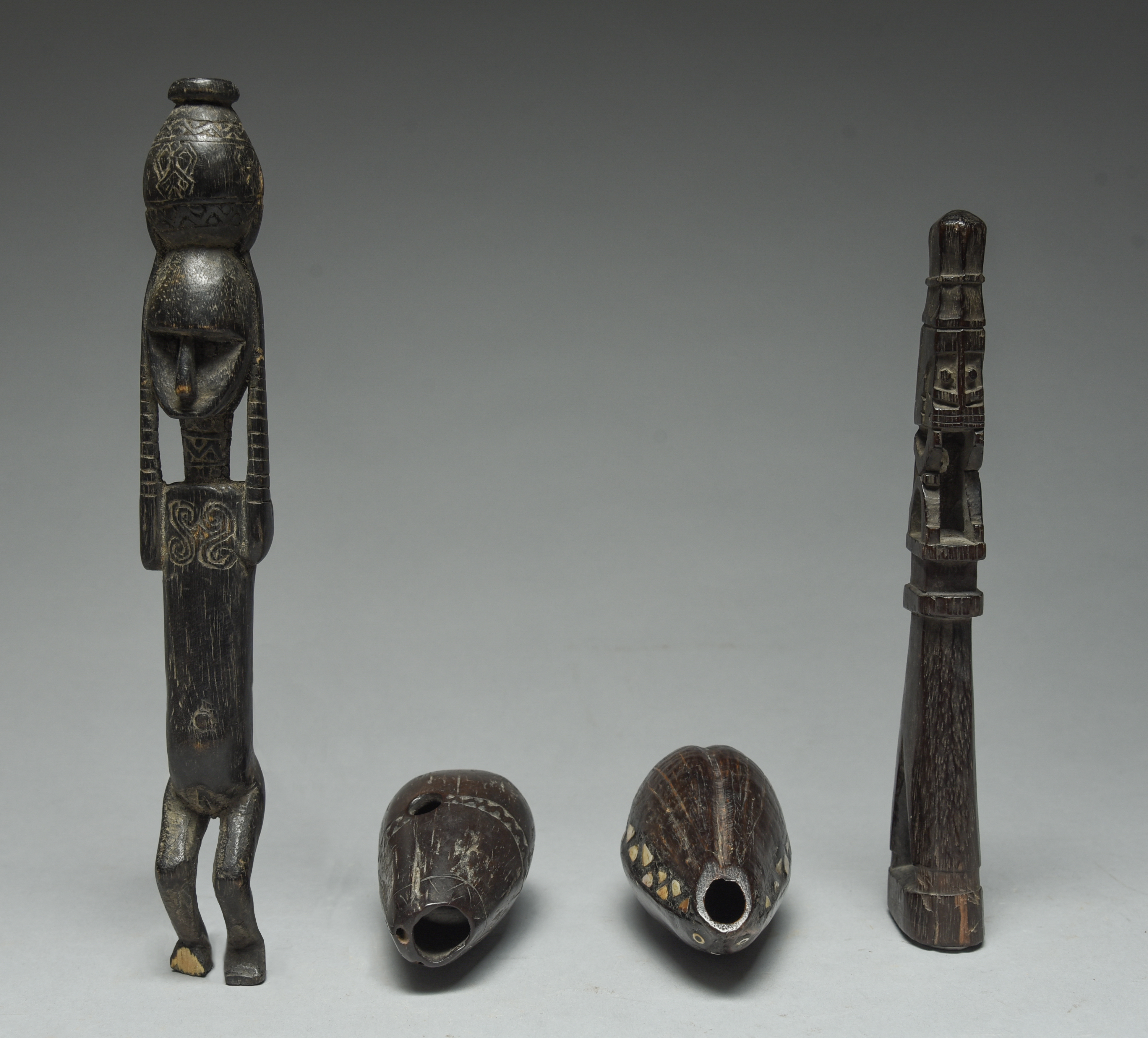 a Massim coconut whistle, 11cm long, a Melansian coconut charm with shell inlay, 13cm long, and a Massim standing figure, 25cm high. (4)