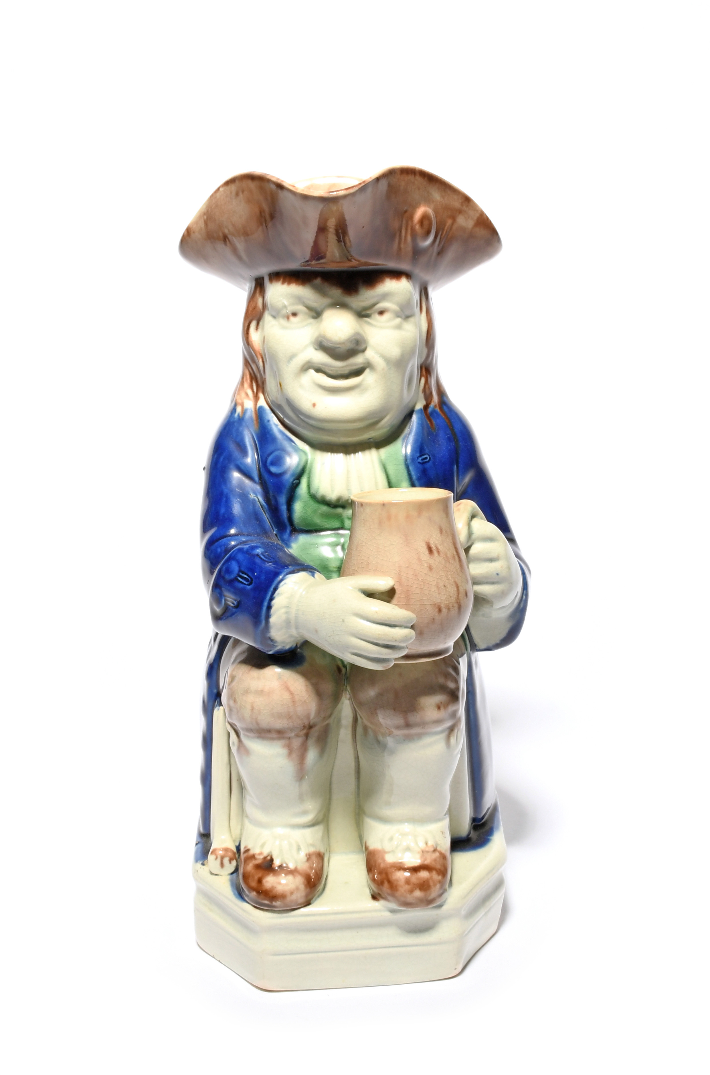 A rare Wood type double-based Toby jug, c.1785-95, wearing a blue coat over a green waistcoat, his
