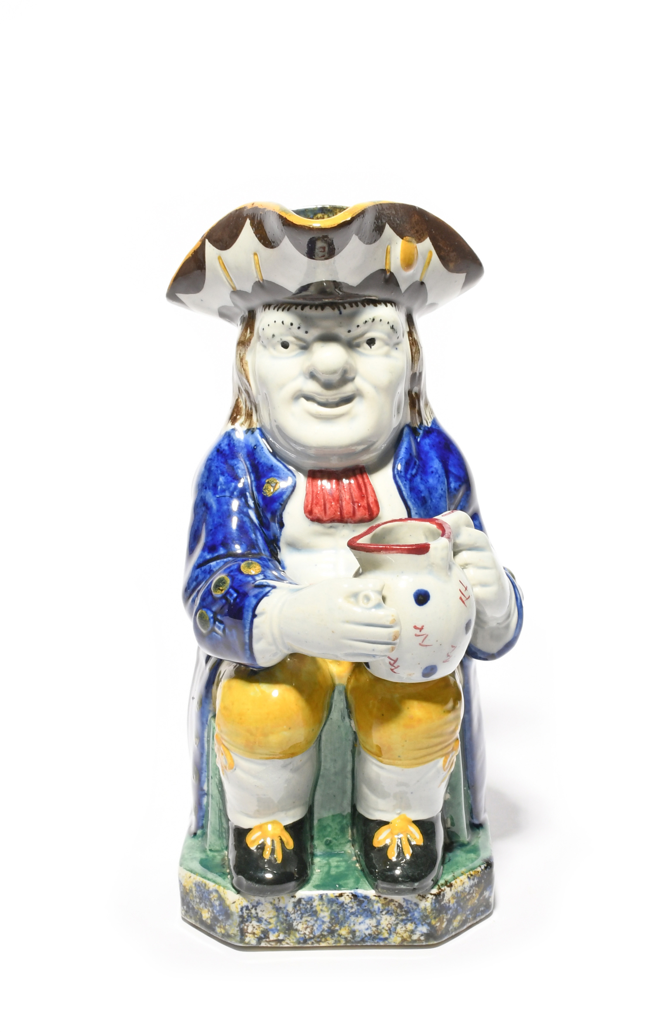 A Mexborough (Yorkshire) Toby jug, c.1820, seated with a patterned jug of ale, wearing a deep blue coat over yellow breeches, sponged in blue, yellow and black to the hat interior and base, 23.7cm.