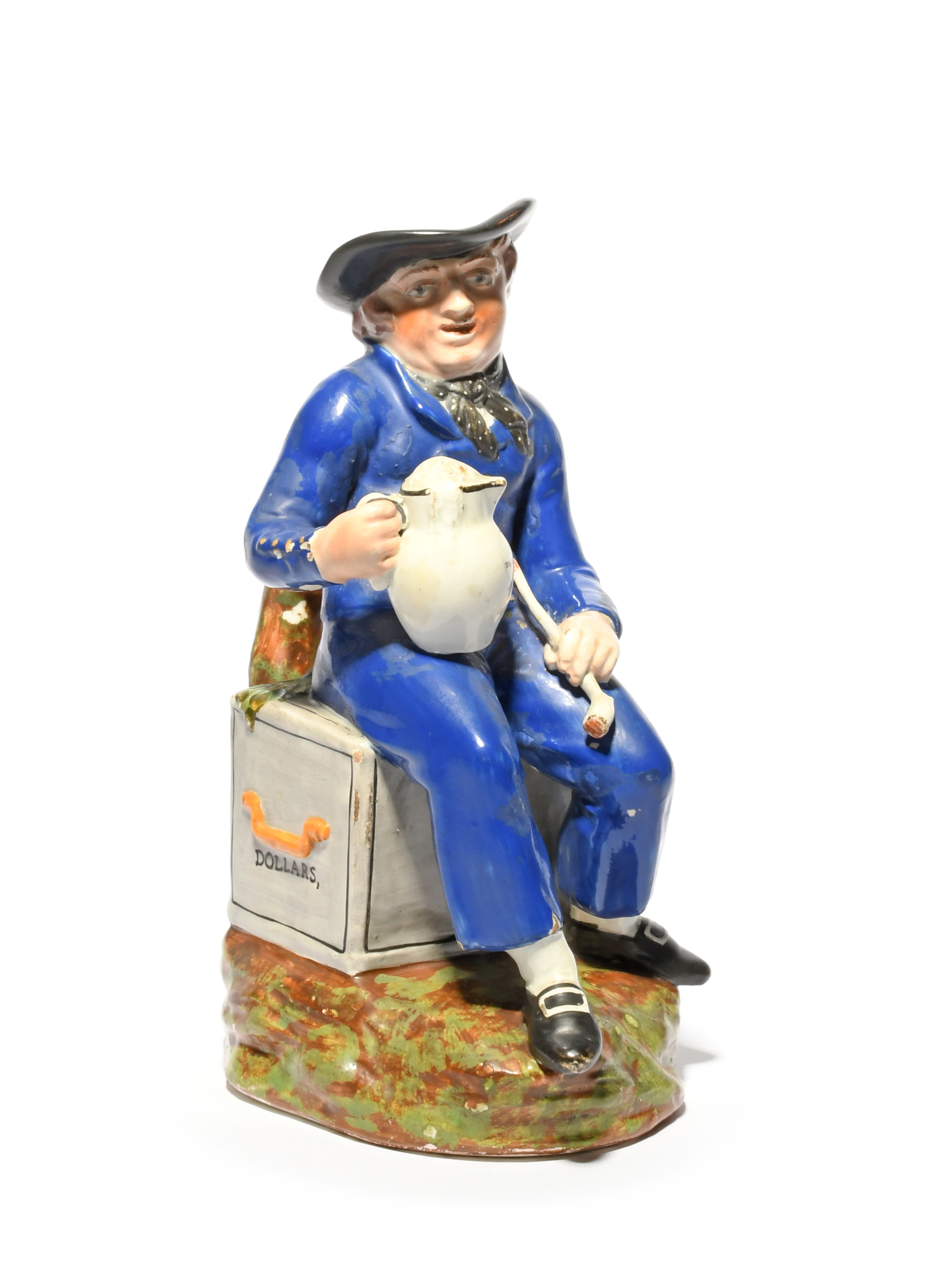 An American Sailor Toby jug, c.1820, wearing a blue uniform with yellow buttons and seated on a sea chest inscribed with the word 'Dollars', holding a foaming jug of ale titled 'Success to our Wooden Walls', some retouching, restoration to his hat, 25cm.