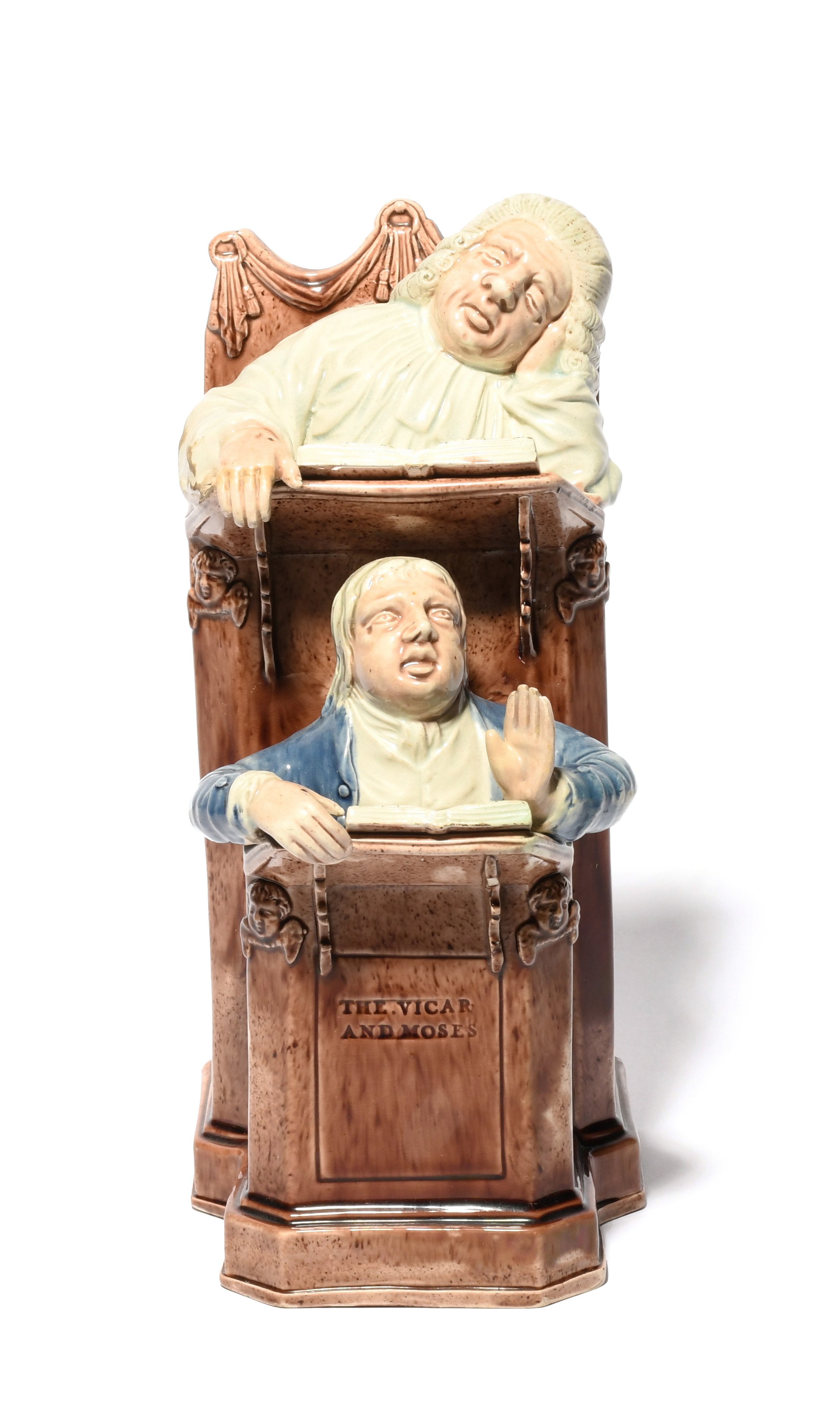 A Ralph Wood model of the Vicar and Moses, c.1785-90, typically modelled with the sleeping cleric above his industrious clerk, each with an open book before them, the pulpit applied with cherub masks to the corners, titled to the front, minor repairs, 24cm.