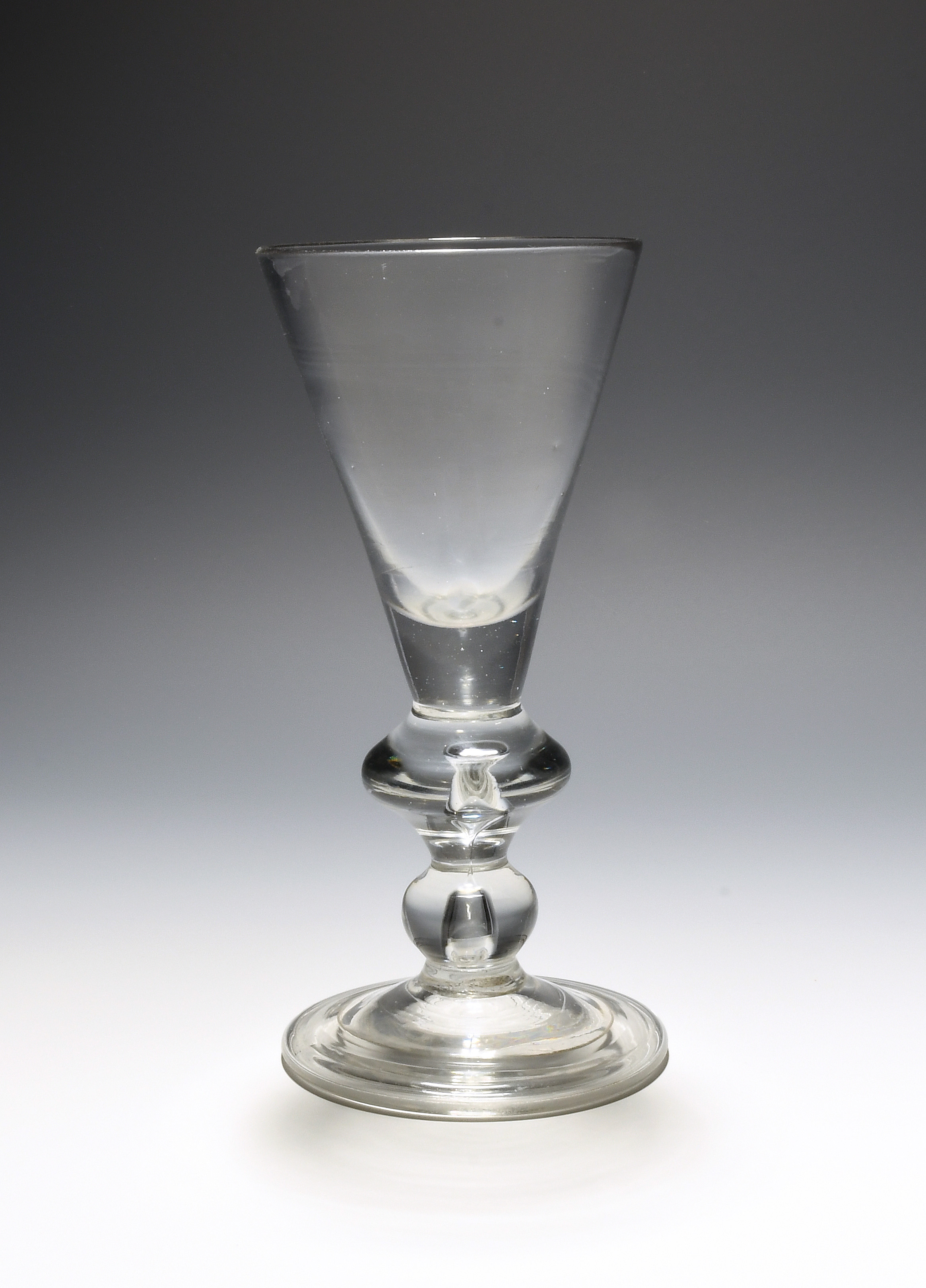 A heavy baluster wine glass or goblet, c.1710, the drawn trumpet bowl with a solid base, the stem with an angular knop over a basal ball knop enclosing a tear, raised on a folded conical foot, 18cm.