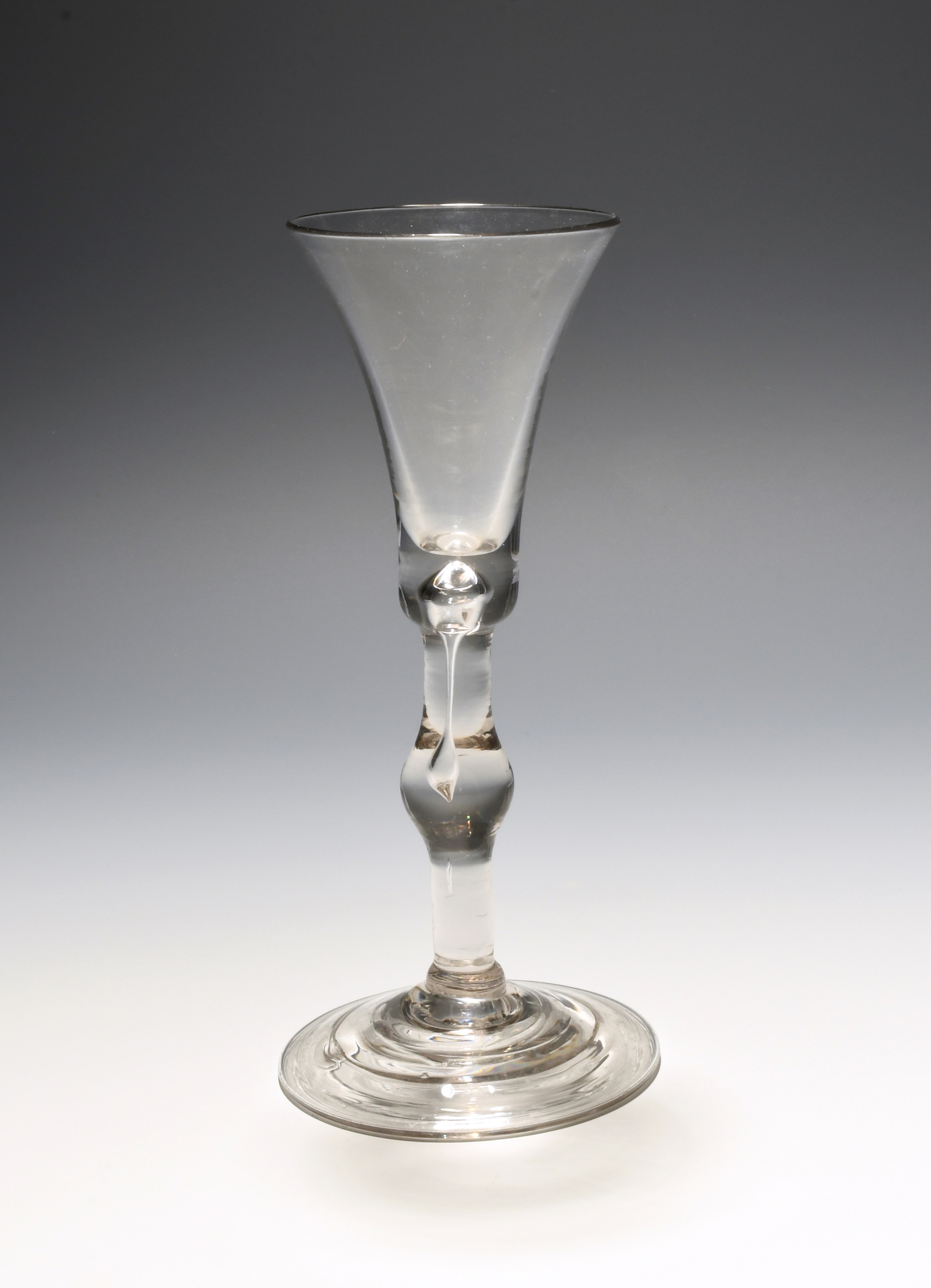 A slender balustroid wine glass, c.1730-40, the narrow funnel bowl rising from a plain knopped stem