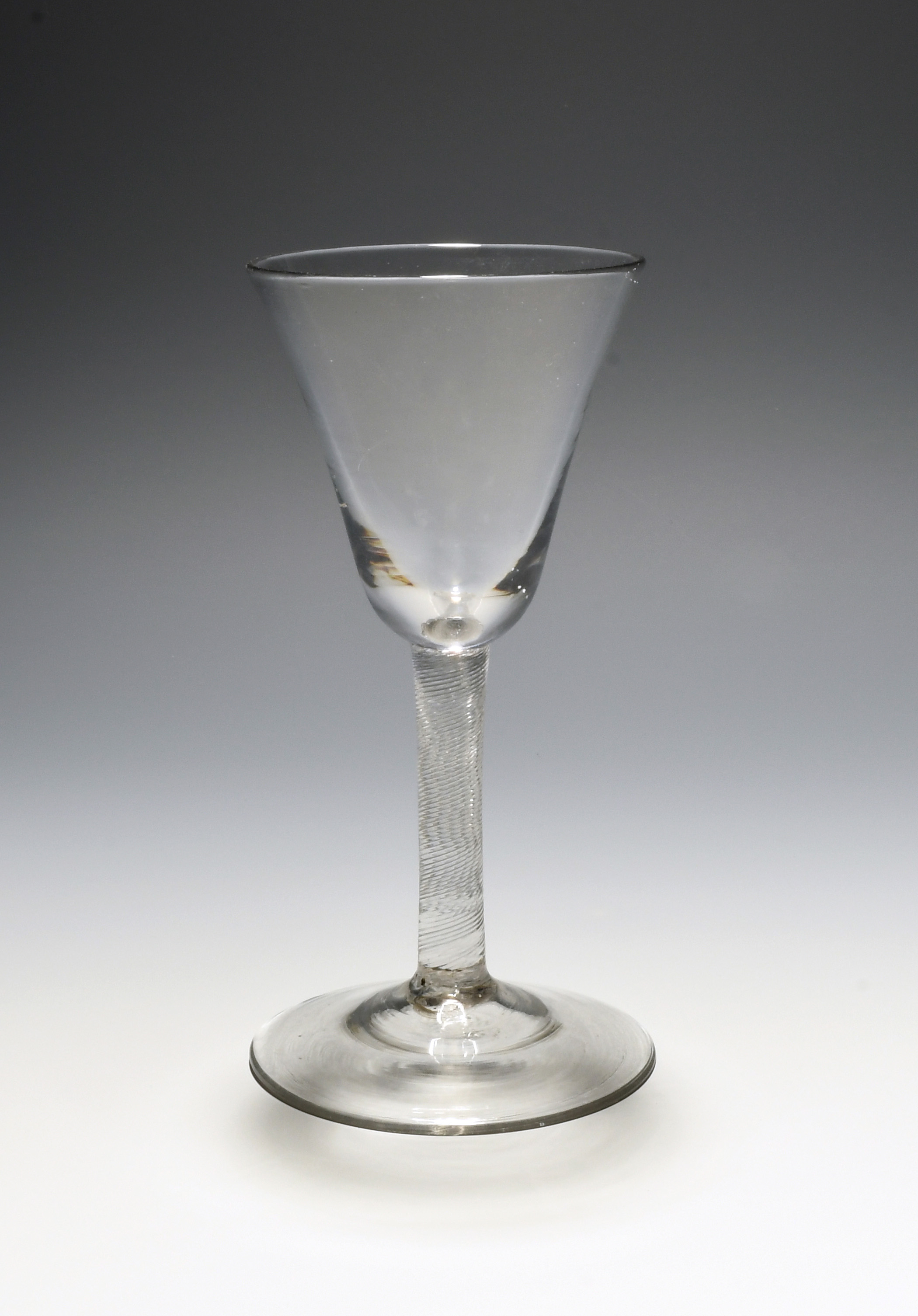 An incised twist wine glass, c.1750-60, the round funnel bowl raised on an incised twist stem over a conical foot, 14.8cm.