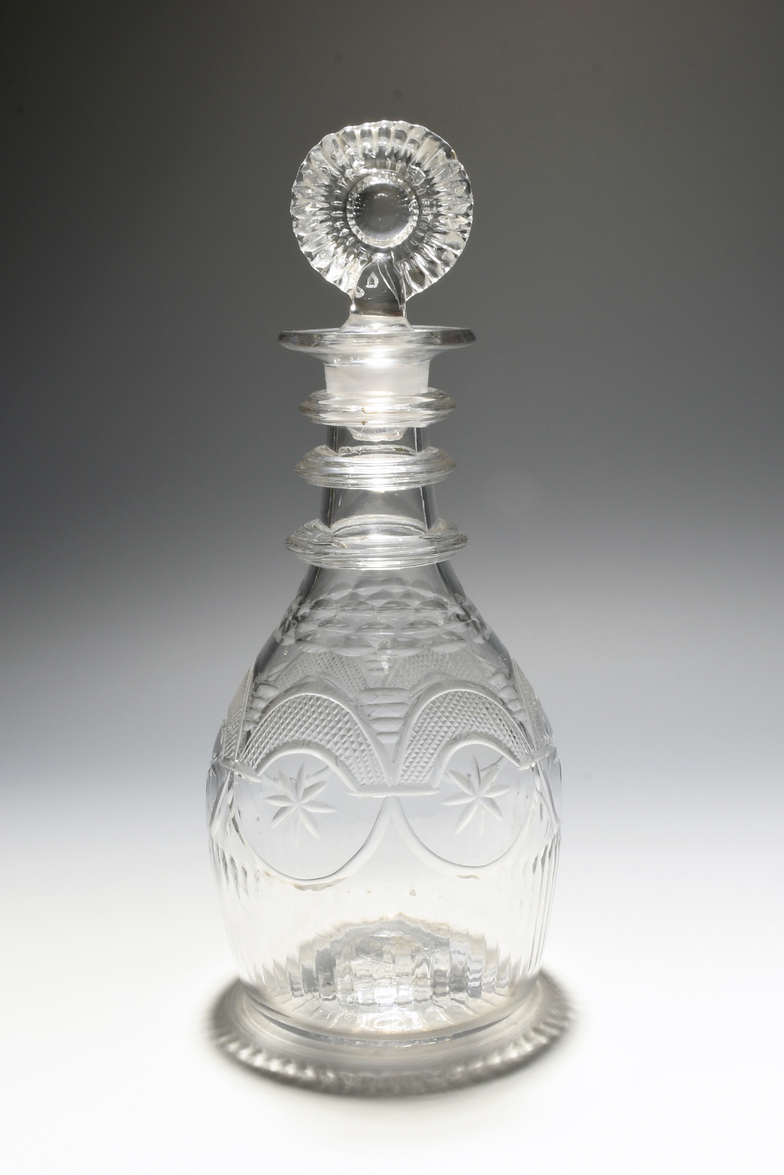 An Irish glass decanter and stopper, c.1820, Waterloo Glass Works of Cork, of Prussian shape, engraved with star motifs and hobnail crescents above a band of vertical moulded flutes, the neck applied with three rings, with a moulded bullseye stopper, traces of a moulded mark to the base, 27.5cm. (2)