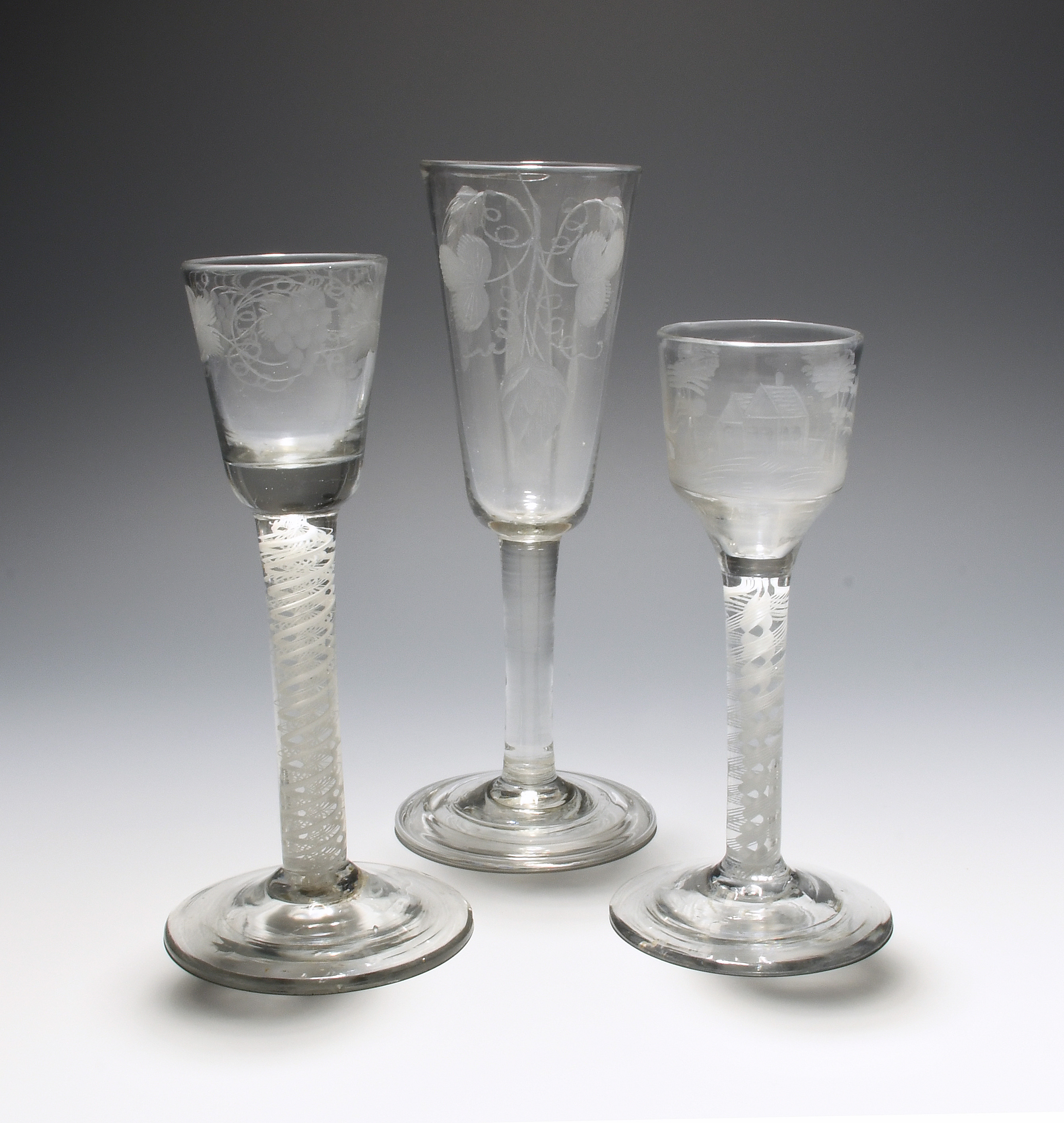 Two wine glasses and an ale glass, c.1740-60, the taller wine with a small bowl engraved with
