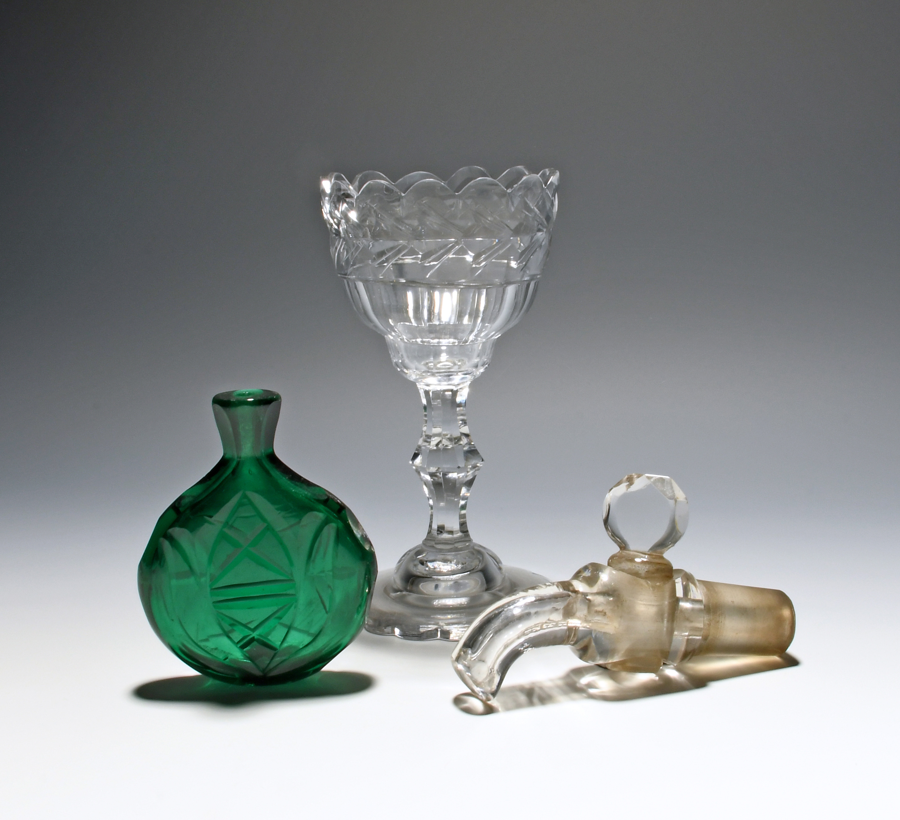 A sweetmeat glass, c.1760, the ogee bowl cut with flutes and a scalloped rim over a knopped faceted stem, an emerald green scent flask cut with a plain cartouche and a geometric design, and a glass barrel tap and stopper of pistol form, 16.8cm max. (4)