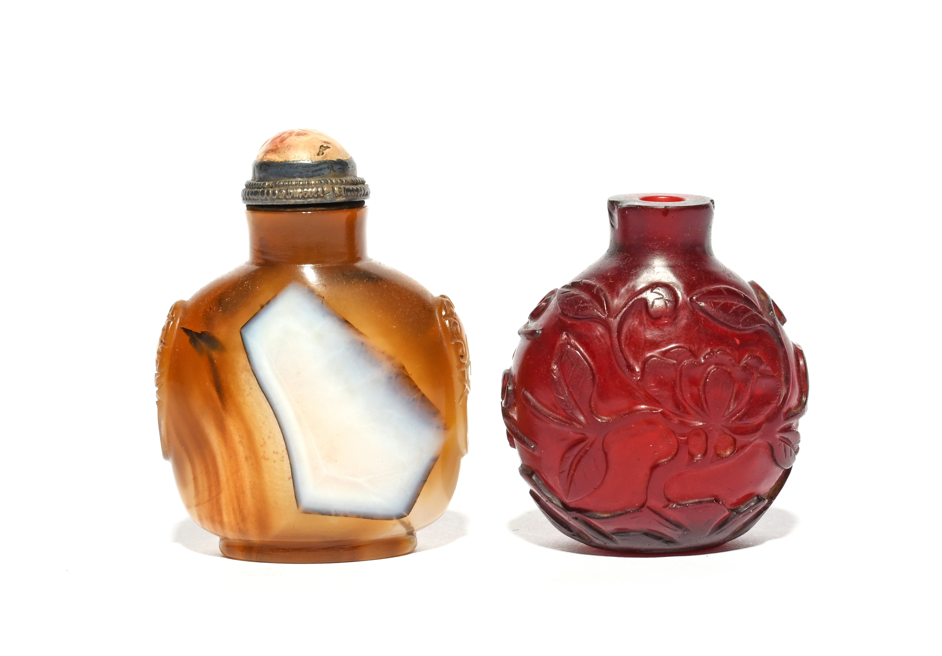 Two Chinese snuff bottles, 19th century, one red glass and carved with flowering magnolia, the other simulating agate, set with a metal-mounted stopper and spoon, the shoulders with stylised masks, small chips, 7.4cm. (2)